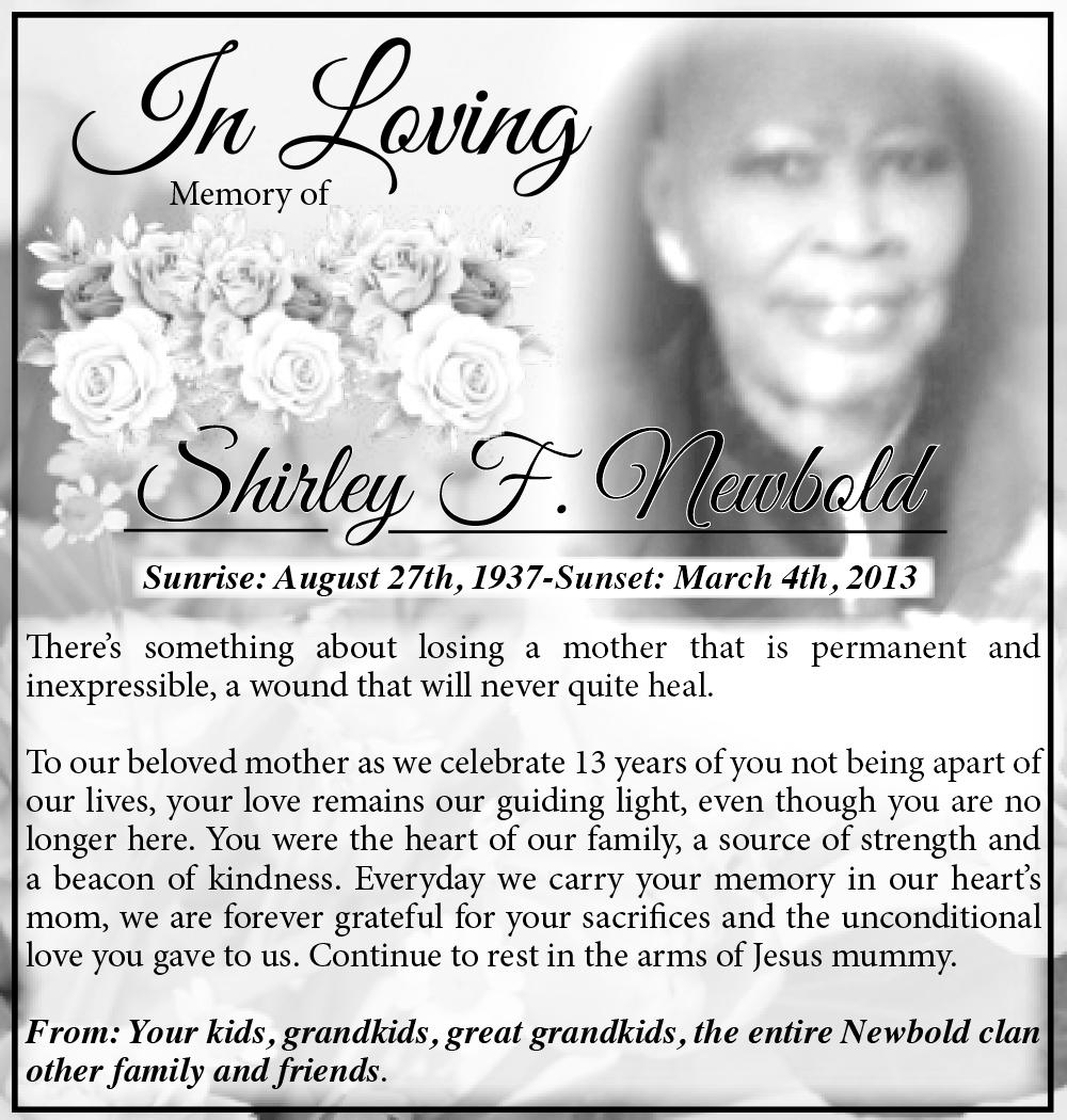 Left to cherish her memories are her, Husband: Shawn Major; Son: Tevin, Shawn Jr., Shakor & Trumaine Major and Darrius Taylor; Daughters: Shenique Johnson, Scotia Poitier, Tanzania Taylor, Lashawna, Lashawn, Phylicia & Shawndice Major; Grandchildren: Amare & Amara Major; Parents: Rev. Wilbert & Thelma Clayton; Brothers: Clint & Arthur Wilson, Anthony Price and Winston Clayton; Sisters: Christell Simmons, Linda Duncombe, Latoya Sutherland, Natasha and Sandra Johnson; Daughter-in-law: Rose Major; Brother-in-law: FCPO Gilbert Simmons, Joseph Major, Sheldon and Trevor Alleyne; Sister-in-law: Patrice Thompson, Xavere Archer, Lisa Tucker, Linda Wilson and Jaynell Major; Nephew: Marco Butler, Carl Knowles, Marine Seaman Milton Higgs, Remon Johnson, Ray Price, Clint Jr. Wilson, Eddison Butler Jr.; Nieces: Nathalie Higgs, Tina Price, Angelique, Tempestte, Clintera Wilson, Santia Johnson, Avetia Butler & Lakeshia Lockhart; Aunts: Delores Seymoure (New York), Christine Swain, Mary Rolle, Martha Butler, Sheva McKenzie, Barbara Knowles Dolly Rolle and Lakeshia Lockhart; Uncles: James Rolle, Anthony Bosfield and Franklyn Saunders; Numerous Cousins & Friends: Paula, Patrick, Dino, Melonie, Arthur Seymour, Vandette and James Rolle, Michael, Keno, Patrick Jr., Mark Bosfield, Karen Wilson & Family, Althea Ferguson & Family, Omeka & Crystal Meers, Leonard Darville, Yvonne Sherman, Charmaine Young, Ronnie, Vanessa Margaret (New York), Charmaine Sears, Linda Storr, Lisa Nairn, The Security Masters Team, WEMCO Warwick Family, The Brougham Community, Apex Award Family, Sysco, Coco Cay, The Berry Island Community, Pastor Lester & Minister Ladonna Thurston & United Christian Cathedral Family, Nurse Barr & Nurse Seymour, Female Surgical 1, Royal Beach Club Family & Numerous relatives too many to mention.
