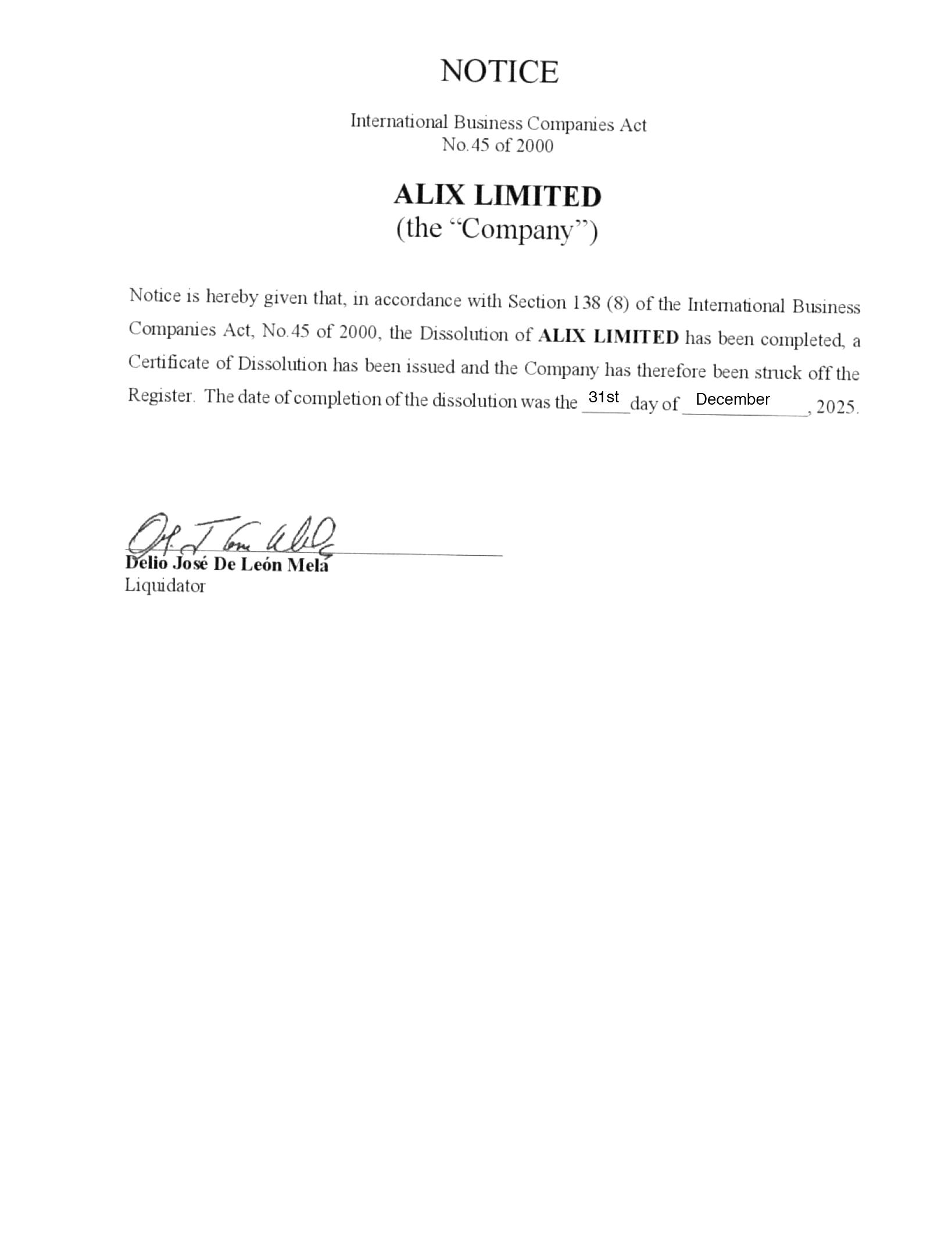 Notice is hereby given that in accordance with Section 138 (8) of the International Business Companies Act, No.45 of 2000, the dissolution of completed, a Certificate of Dissolution has been issued and the Company has therefore been struck off the Register. The date of completion of the Dissolution was the 31st of December, 2025.
