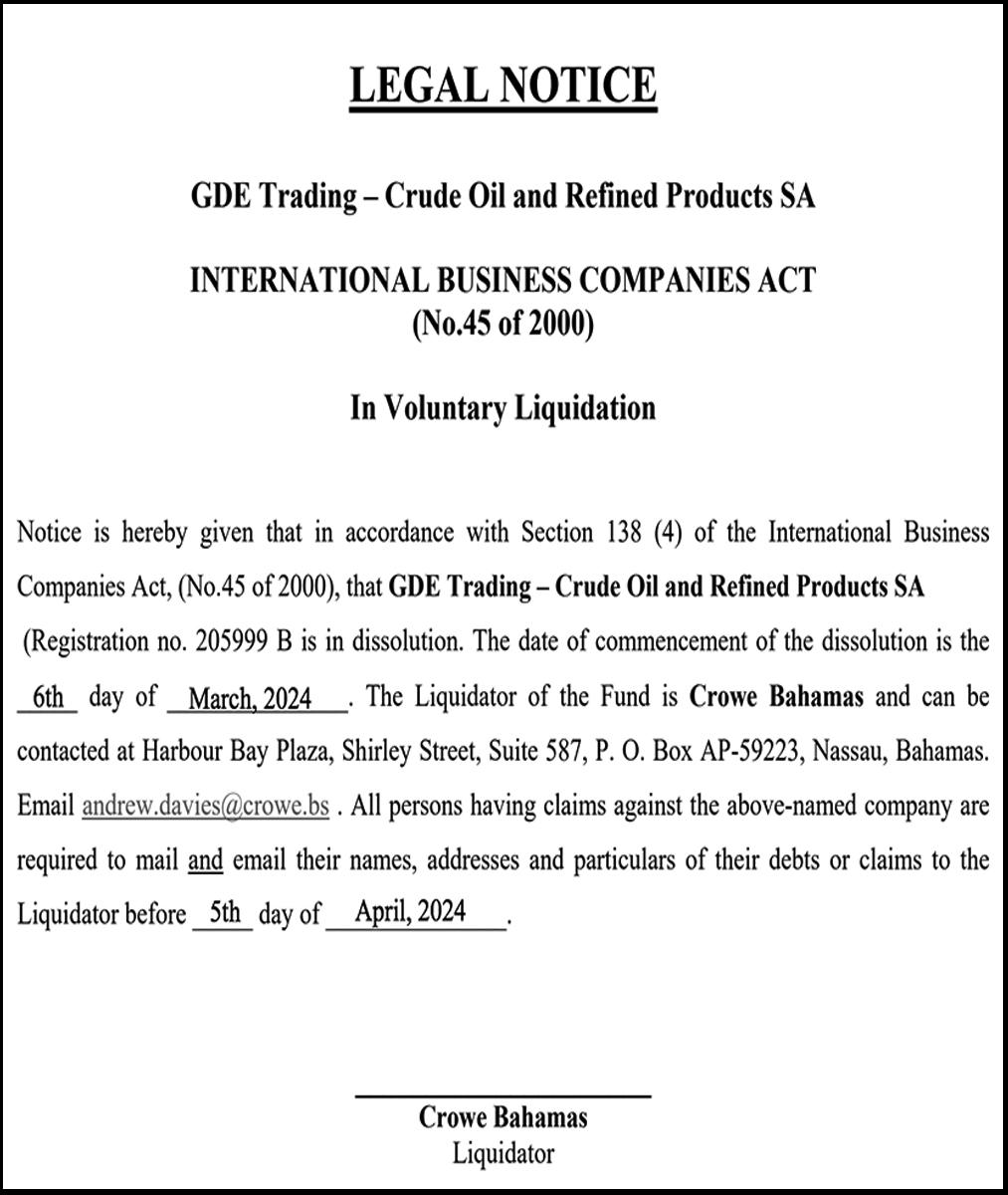 2024 International Liquidator Services Ltd. situated at 3rd Floor Whitfield Tower, 4792 Coney Drive, Belize City, Belize is the Liquidator.