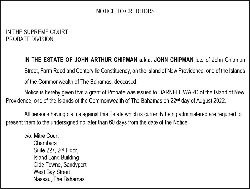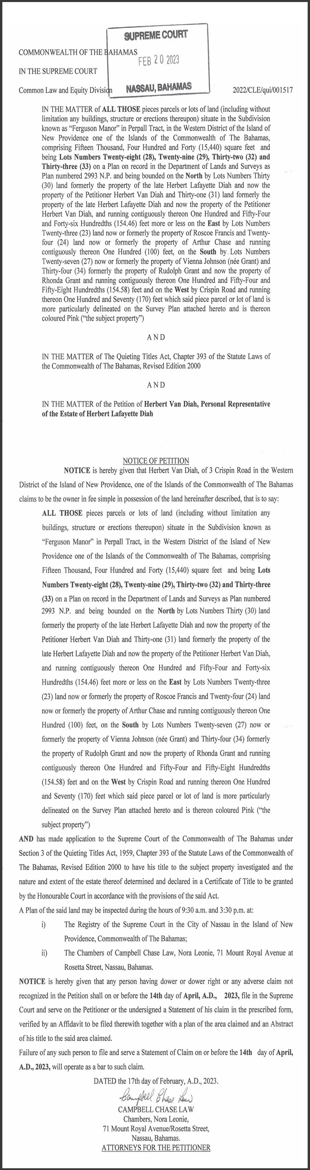 NOTICE is hereby given that CHRISTOPHER STEWART of P. O. Box AP-59223, Eastbrook Road, Highland Park, New Providence, The Bahamas, is applying to the Minister responsible for Nationality and Citizenship, for registration/naturalization as a citizen of The Bahamas, and that any person who knows any reason why registration/naturalization should not be granted, should send a written and signed statement of the facts within twenty-eight days from the 13th day of March, 2023 to the Minister responsible for nationality and Citizenship, P.O. Box N-7147, Nassau, Bahamas.