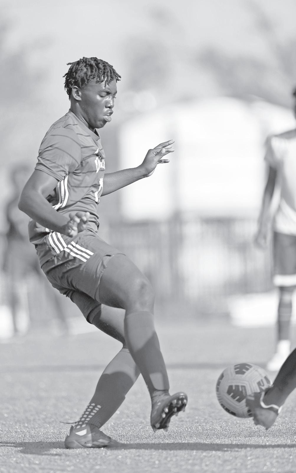 UNIVERSITY of The Bahamas Mingoes midfielder Nathan Well (blue 19) moves the ball against Bears FC Sunday in Bahamas Football Association action.