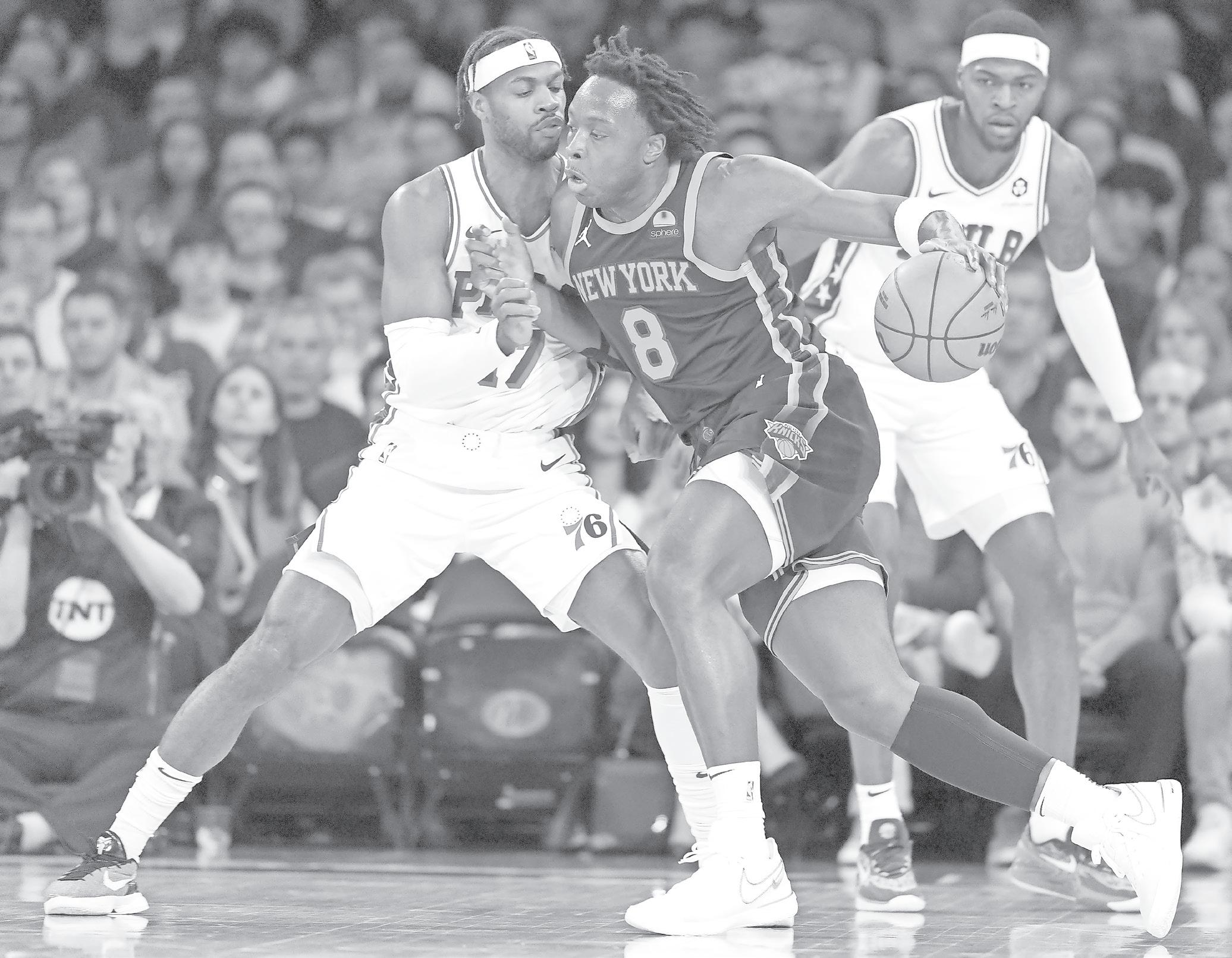 NEW York Knicks forward OG Anunoby (8) drives against Philadelphia 76ers guard Buddy Hield, left, during the first half of an NBA basketball game on Tuesday at Madison Square Garden in New York. (AP Photos/Mary Altaffer)