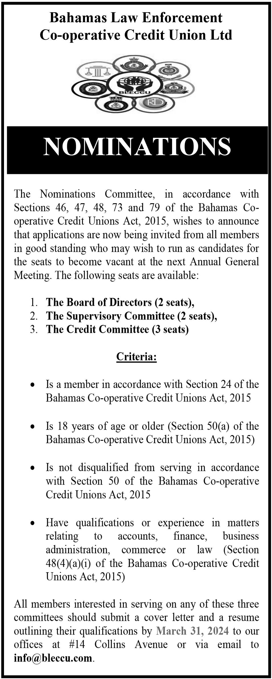 Nominations forms are available at our Nassau and Freeport offces or by emailing sthompson@pwccu.org.