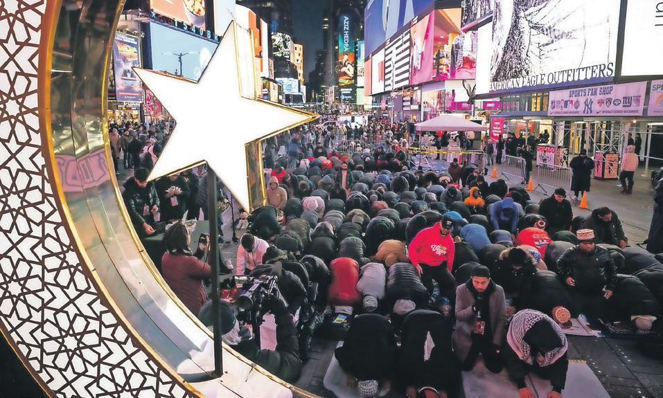 MEMBERS of the Muslim community gather for the Taraweeh prayer during a month of Ramadan at New York's Times Square, Sunday, March 10, 2024. Photo:Yuki Iwamura/AP