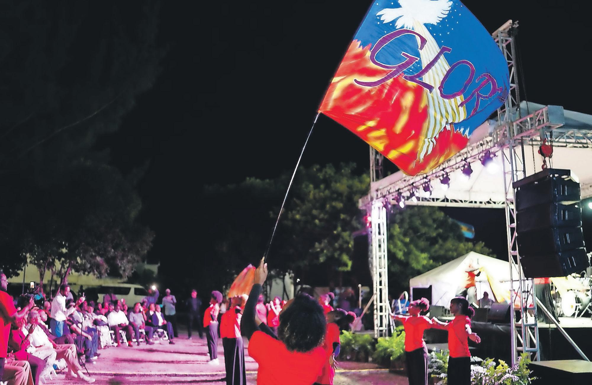 LEFT: A large flag with the word “Glory” is waved in the air as the Christian Life dance troupe performs.