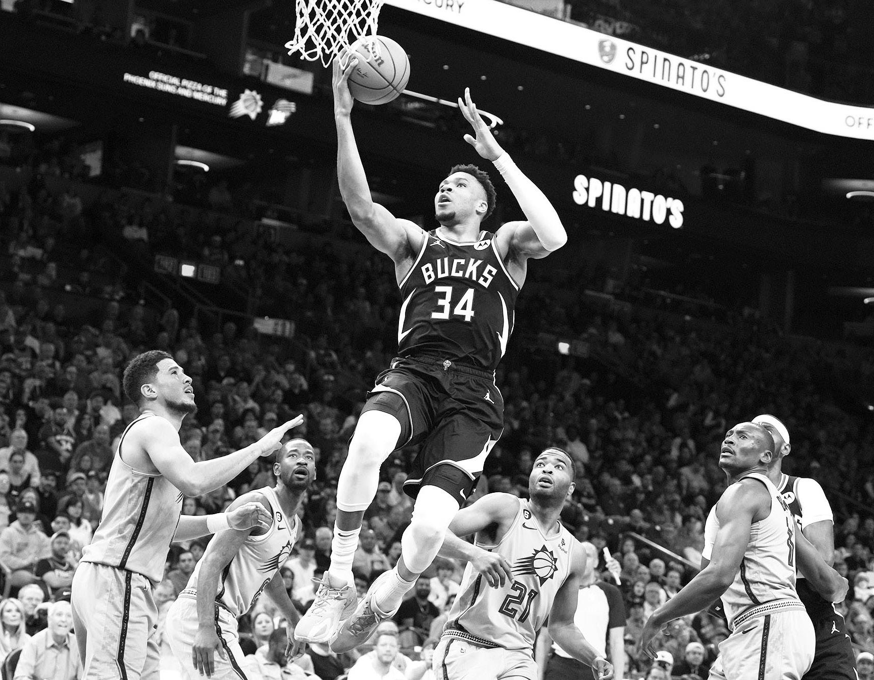 Giannis Antetokounmpo scored 36 points, Brook Lopez added 21 and the NBA-leading Milwaukee Bucks clinched a playoff spot by beating the Phoenix Suns 116-104 last night to become the first team to 50 wins this season.
