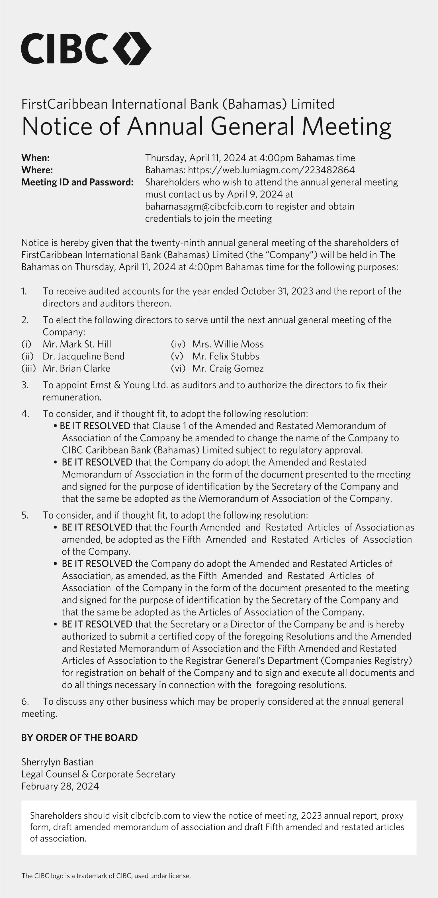 Resources; Department of Statistics Employee; Faustina Wiggins, Environmental Statistician, Regional Statistics Programme, CARICOM Secretariat and Conference Guest. HON. Vaughn P. Miller along with CARICOM Delegates and Department of Statistics Officers and Capacity Building Workshop participants. Photos:Samantha Black STATISTICS CRITICAL FOR ENVIRONMENT, SAYS MILLER would have reached a tipping point." “This tipping point”, Mr Miller added, “is where disasters like Hurricane Dorian, sustained heat, biodiversity loss and human stressors will be commonplace”. Workshops like these, he said, are critical, as "they help us to take a serious look at the human and technical capacity that we have as a nation and conduct an assessment of where we need to be to remain a viable nation". The three-day workshop was very productive. It included exercises to assist in the development of national work plans relative to the production and dissemination of the environment statistics and indicators to increase the availability of data. This in-country capacity building activity is one of three taking place in various CARICOM countries and is funded by the Eleventh European Development Fund (EDF). NOTICE INTERNATIONAL BUSINESS COMPANIES ACT, 2000 IGFCC Holdings Limited (IN VOLUNTARY LIQUIDATION) NOTICE IS HEREBY GIVEN that in accordance with section 138(6) of the International Business Companies Act, 2000, as amended, the winding up and dissolution of IGFCC Holdings Limited is complete. L. Michael Dean Sole Liquidator Address: Equity Trust House Caves Village West Bay Street P O Box N-10697 Nassau, Bahamas N O T I C E EXXONMOBIL SAUDI ARABIA (RED SEA) LIMITED