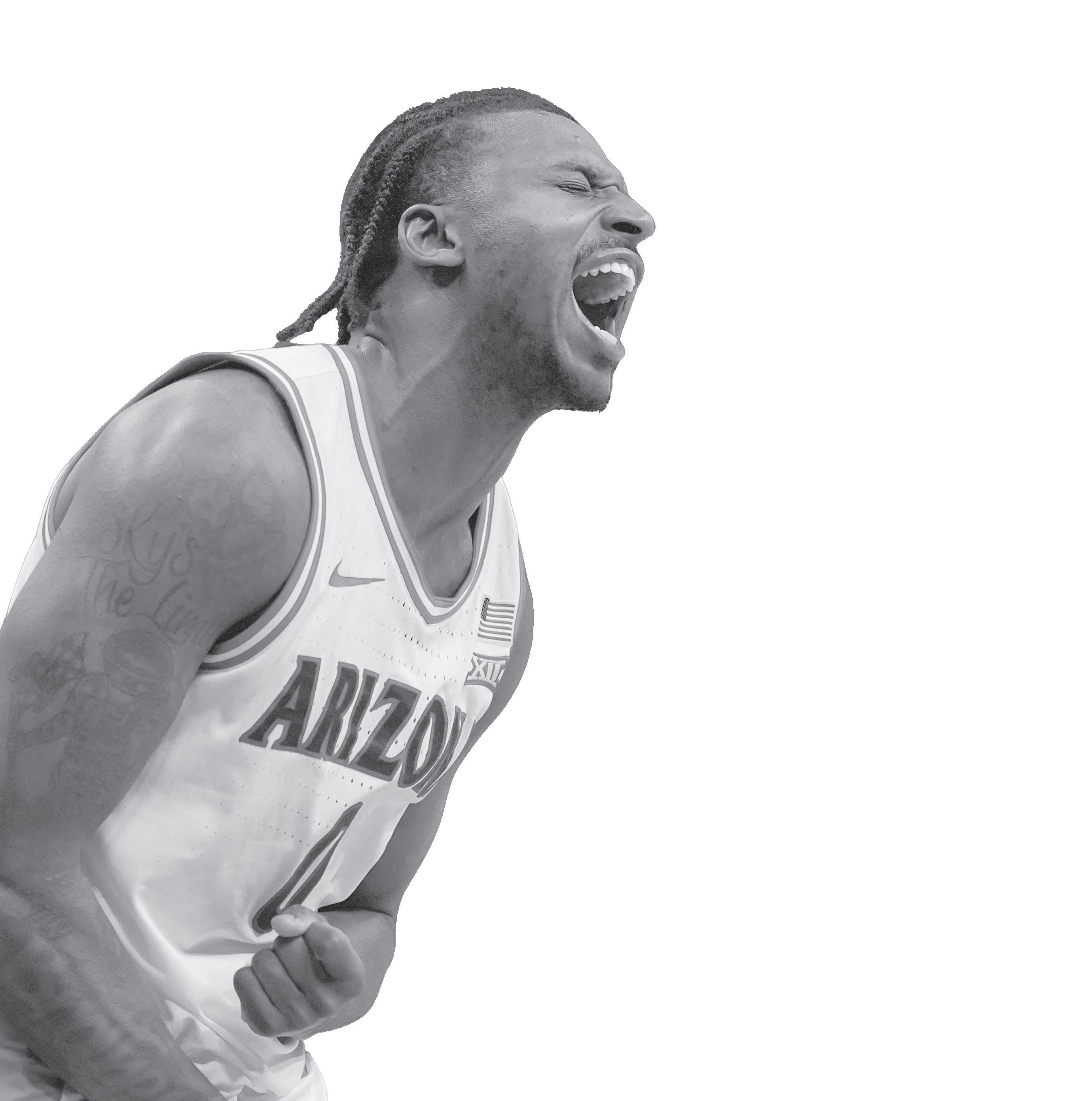 ARIZONA’s Jaden Bradley celebrates after making the game-winning shot at the buzzer to defeat Iowa State during an NCAA college basketball game in the semifinal round of the Big 12 Conference tournament Friday, March 13, 2026, in Kansas City, Mo.