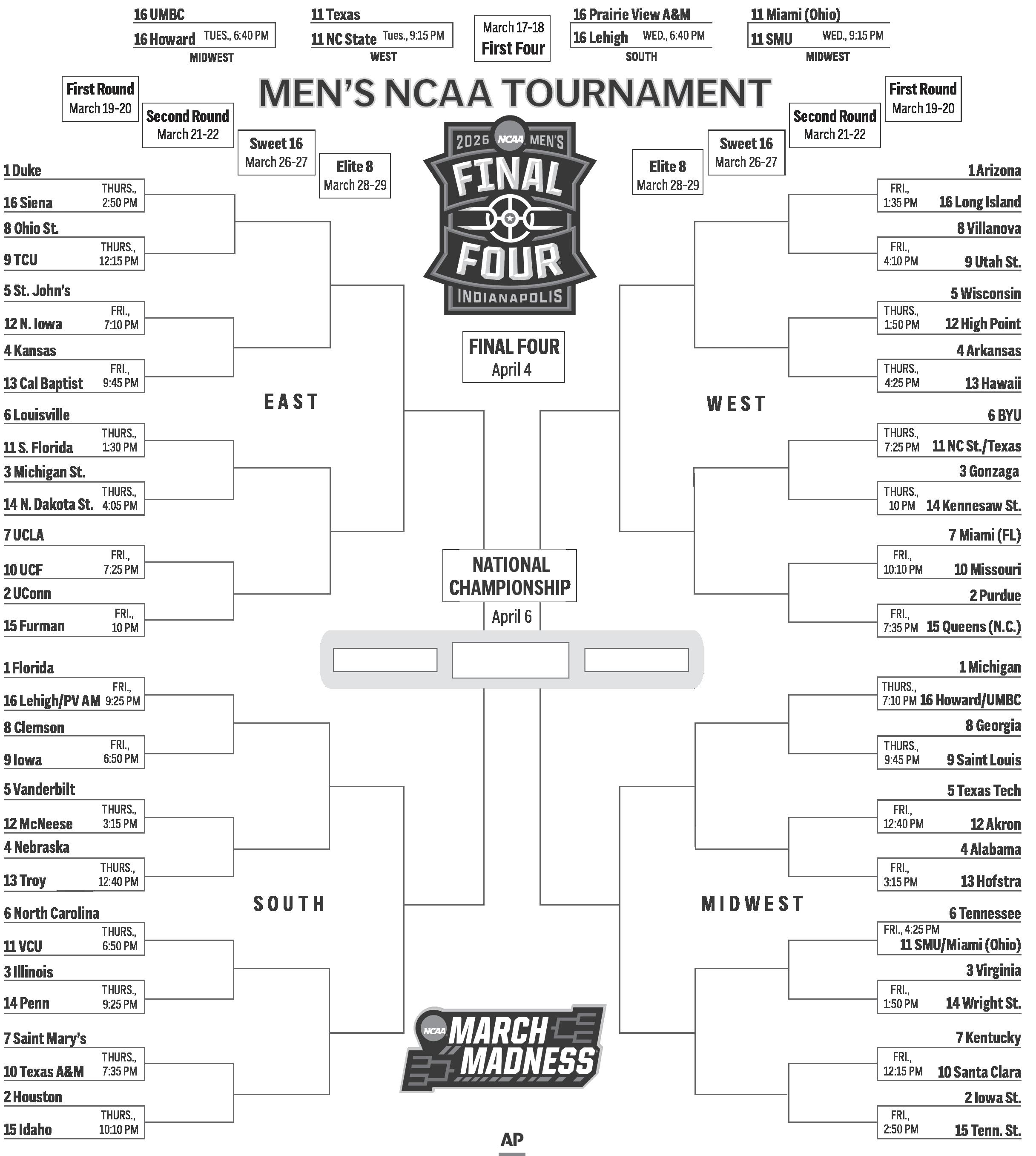 Duke, Arizona, Michigan and Florida earned the No. 1 seeds in the four respective regions. Food for thought: Michigan State in 2000 was the last Big Ten team to win the national championship, which was played that year in Indianapolis, the site of this year’s Final Four. But remember: Three of Duke’s five national championships (1991, 2010 and 2015) were won in Indianapolis while Arizona captured its only national title in Indy in 1997. Florida also won the first of back-to-back national championships in 2006 — in Indy. Games to watch No. 2 seed Purdue (27-8) vs. No. 15 Queens (21-13), Friday, West Region. The Big Ten tourney champs and No. 1 team in the AP preseason poll faces a firsttime NCAA tourney entrant and has a history of early departures against smaller-school teams. Purdue guard Braden Smith needs two assists to break Bobby Hurley’s Division I career record (1,076).