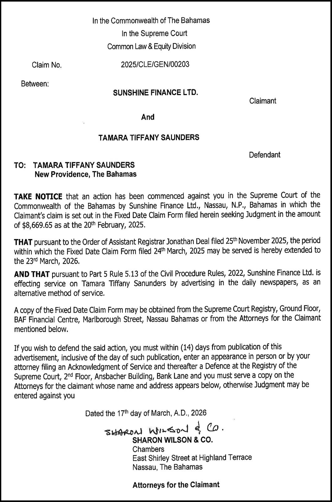 NOTICE is hereby given in pursuance of Section 218(e) of the Companies (Winding Up Amendment) Act, 2011, that the Members of the above-named Company by Resolution passed on the 5th day of March 2026 resolved that the Company be wound up voluntarily forthwith and that the Liquidator be Mr. Bennet R. Atkinson of Ronald Atkinson & Co., Chartered Accountants, Marron House, Virginia and Augusta Streets, P.O. Box N-8326, Nassau, Bahamas.