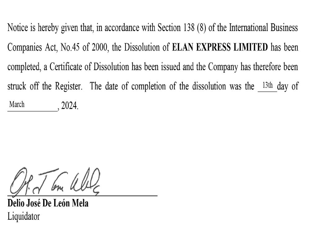 Notice is hereby given that in accordance with Section 138(4) of the International Business Companies Act 2000, the abovenamed Company is in dissolution, which commenced on the 13th day of March, 2026. The Liquidator is Windermere Corporate Management Limited, 200 Sterling Commons East, Harbour Drive, Paradise Island, Bahamas.