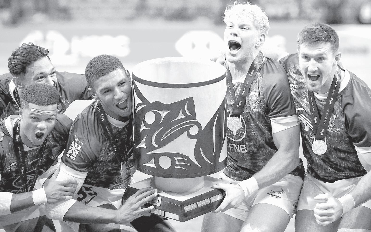 SOUTH Africa’s Gino Cupido (35) prepares to lift the champion’s cup with his team to celebrate after defeating Spain during the gold medal Vancouver Sevens rugby match, in Vancouver, British Columbia, Sunday, March 8, 2026. Photos: Ethan Cairns/The Canadian Press via AP