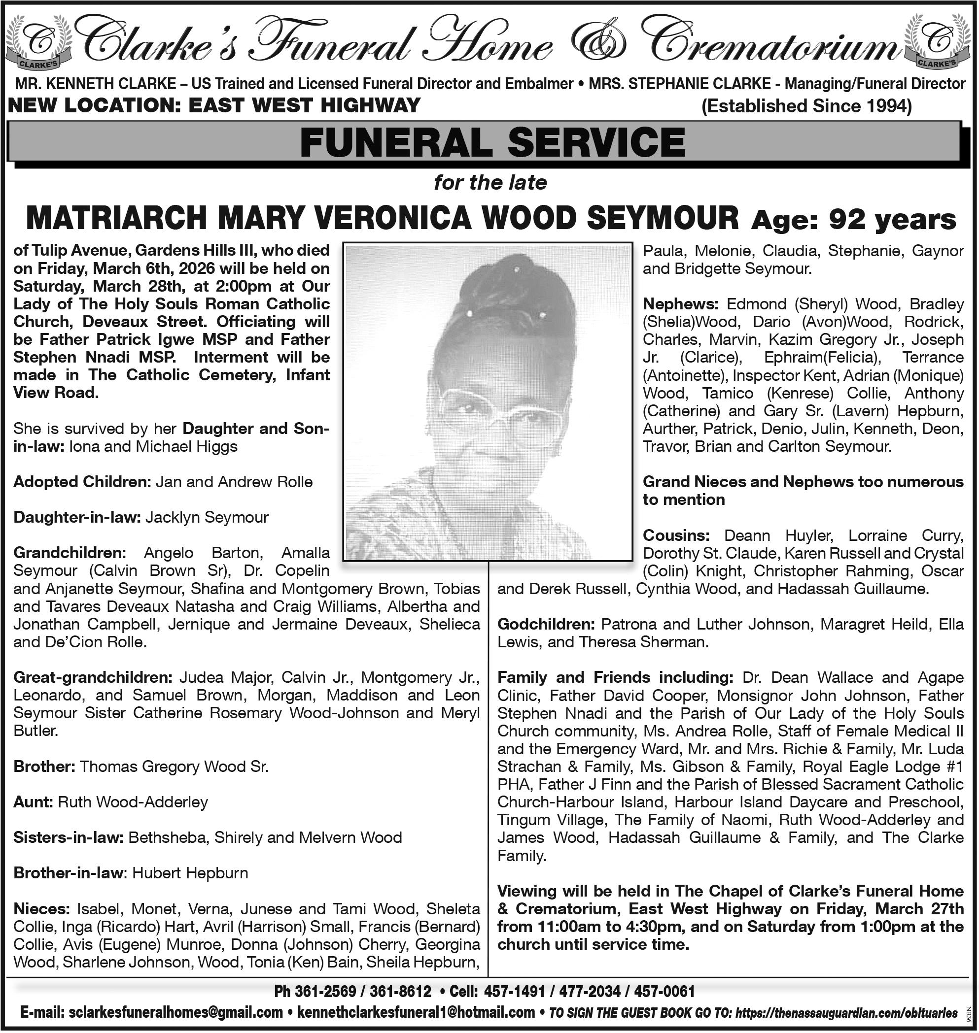 Friends and family can pay their last respects at St. Ambrose Funeral Home, Arundel Street, New Providence on Friday, 28th March, 2026 from 11:00am - 4:00pm.