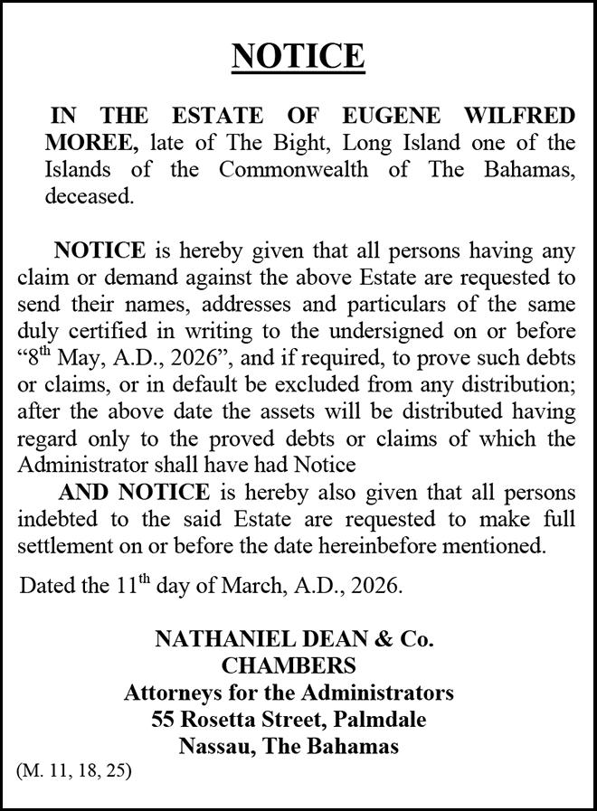 NOTICE is hereby given that I JEAN RENAUD LEGISTE of Peach Street, Nassau, The Bahamas, applying to the Minister responsible for Nationality and Citizenship, for Registration Naturalization as a citizen of The Bahamas, and that any person who knows any reason why registration/ naturalization should not be granted, should send a written and signed statement of the facts within twentyeight days from the 23rd day of March, 2026 to the Minister responsible for nationality and Citizenship, P.O. Box N-7147, Nassau, New Providence, The Bahamas.