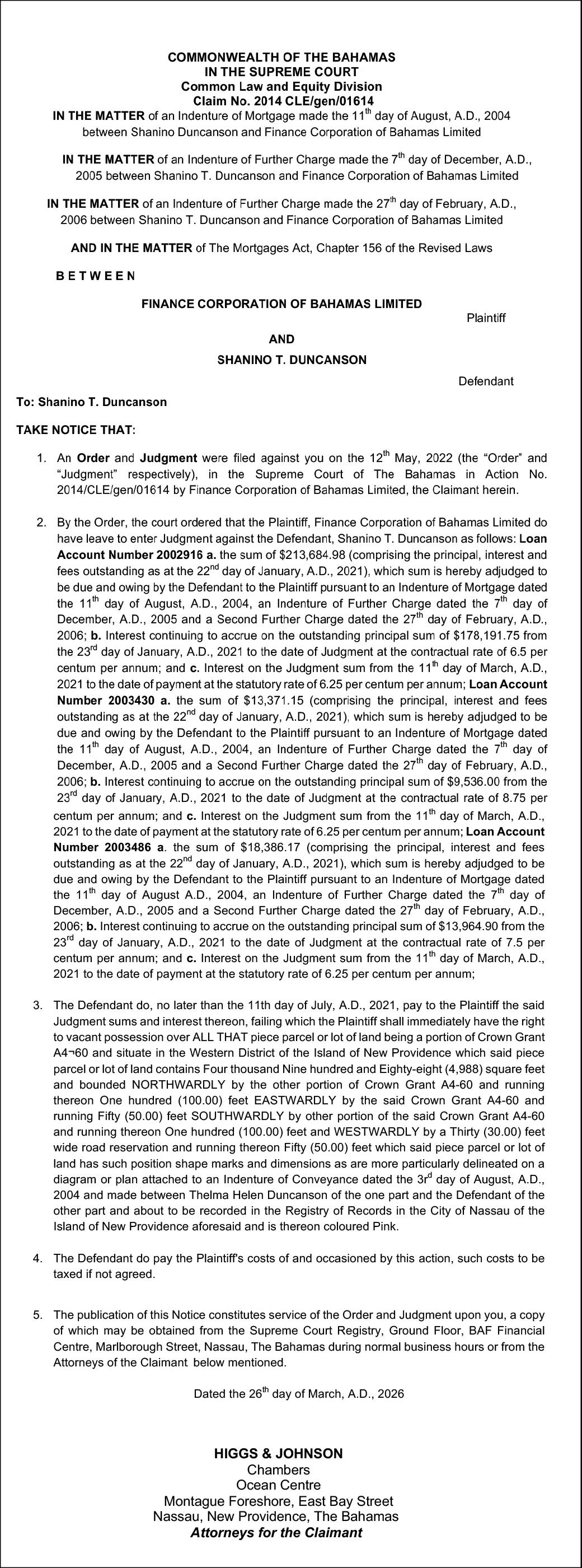 NOTICE is hereby given that JUSTIN DARIUS of Marsh Harbour, Abaco, Bahamas is applying to the Minister responsible for Nationality and Citizenship, for registration/naturalization as a citizen of The Bahamas, and that any person who knows any reason why registration/naturalization should not be granted, should send a written and signed statement of the facts within twentyeight days from the 23rd day of March, 2026 to the Minister responsible for nationality and Citizenship, P.O. Box N-7147, Nassau, Bahamas.