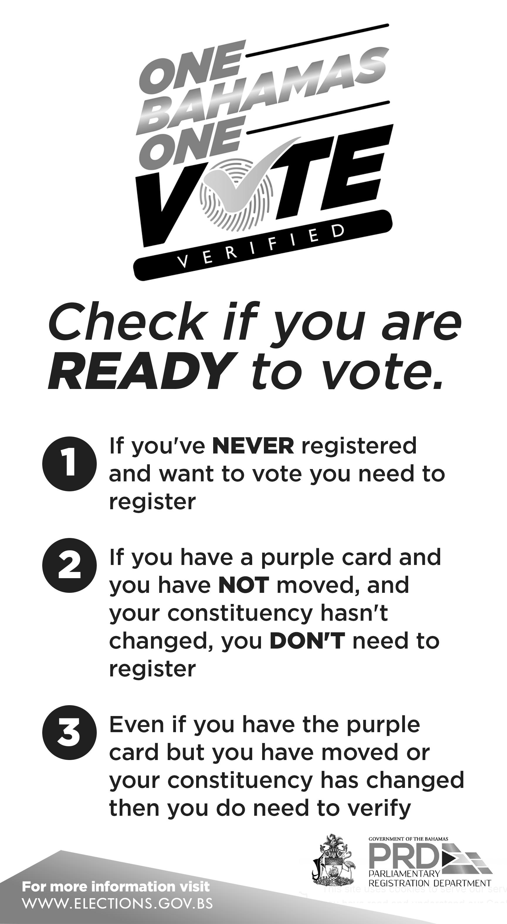 Thosewho movedsincethe lastelection needtoregister tovote intheir newconstituency. Visitelections.gov.bs toview the available informationonline, email prdelections@bahamas.gov.bs, or call (242) 397-2000.