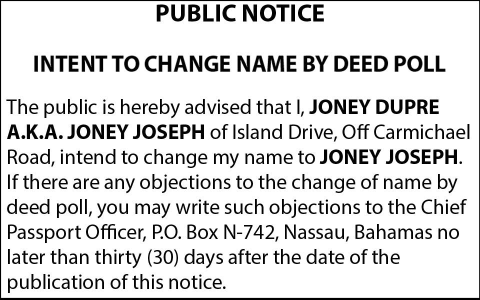 NOTICE is hereby given that I JOSIACE EUGENE of Guana Cay, Abaco, The Bahamas, applying to the Minister responsible for Nationality and Citizenship, for Registration Naturalization as a citizen of The Bahamas, and that any person who knows any reason why registration/ naturalization should not be granted, should send a written and signed statement of the facts within twentyeight days from the 26th day of March, 2026 to the Minister responsible for nationality and Citizenship, P.O. Box N-7147, Nassau, New Providence, The Bahamas.