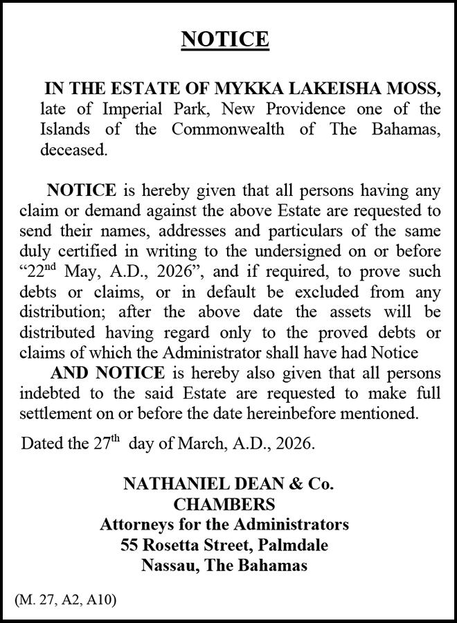 NOTICE is hereby given that I EDITH LAFLEUR of Flamingo, Gardens, Nassau, The Bahamas, applying to the Minister responsible for Nationality and Citizenship, for Registration Naturalization as a citizen of The Bahamas, and that any person who knows any reason why registration/ naturalization should not be granted, should send a written and signed statement of the facts within twentyeight days from the 26th day of March, 2026 to the Minister responsible for nationality and Citizenship, P.O. Box N-7147, Nassau, New Providence, The Bahamas.