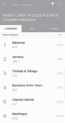 At the end of the third of four days of competition at the Pierre Samot Community Aquatic Centre, The Bahamas extended its lead to 613.50 points, ahead of second place Jamaica, who trail with 558. Trinidad & Tobago is in third with 545.
