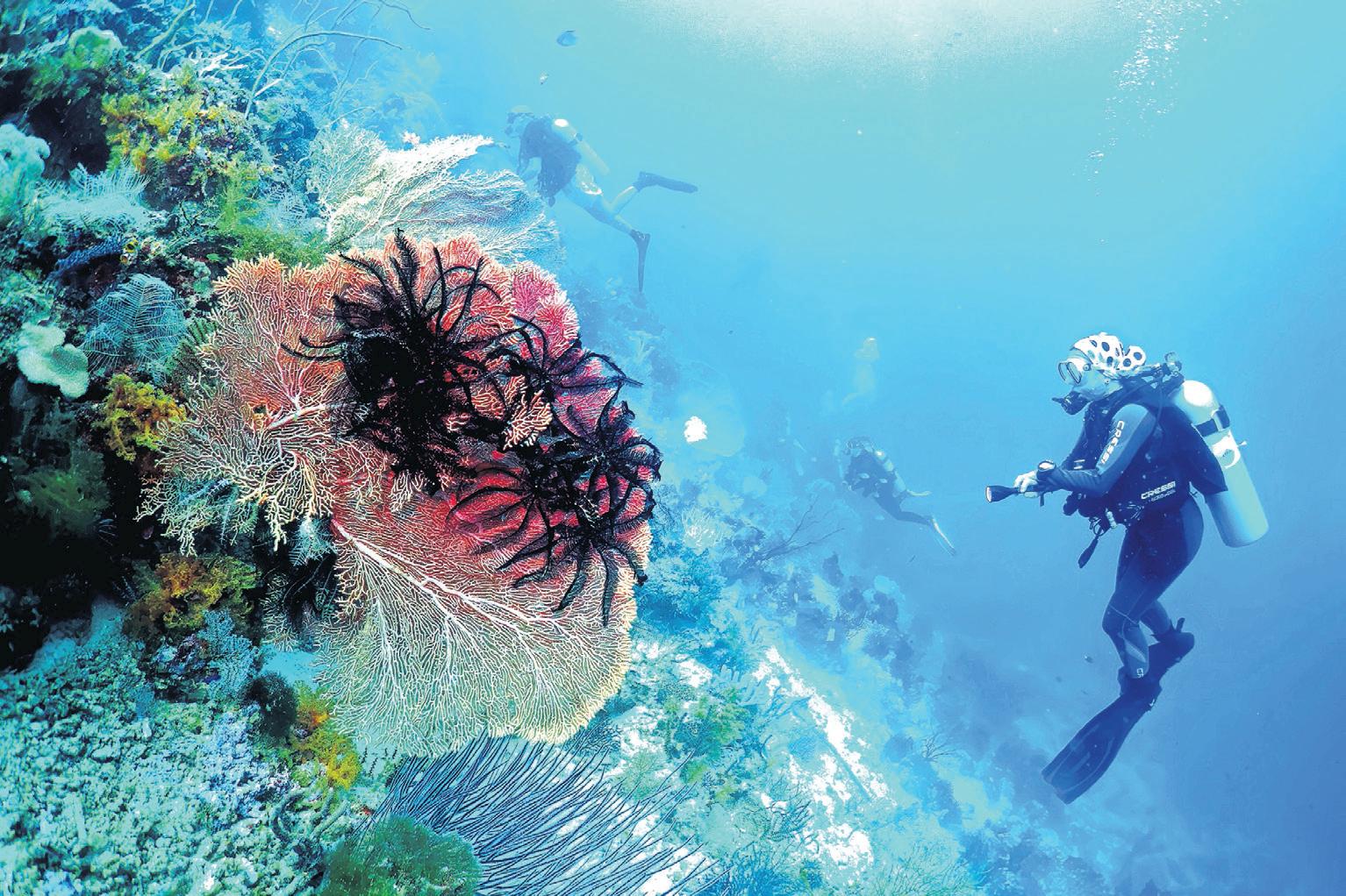 THERE is an explosion of color beneath the surface in Raja Ampat, a remote archipelago in eastern Indonesia where sharks, mantas and sea turtles glide alongside vast schools of fish through sea fan coral formations, some of which are only found in its waters.
