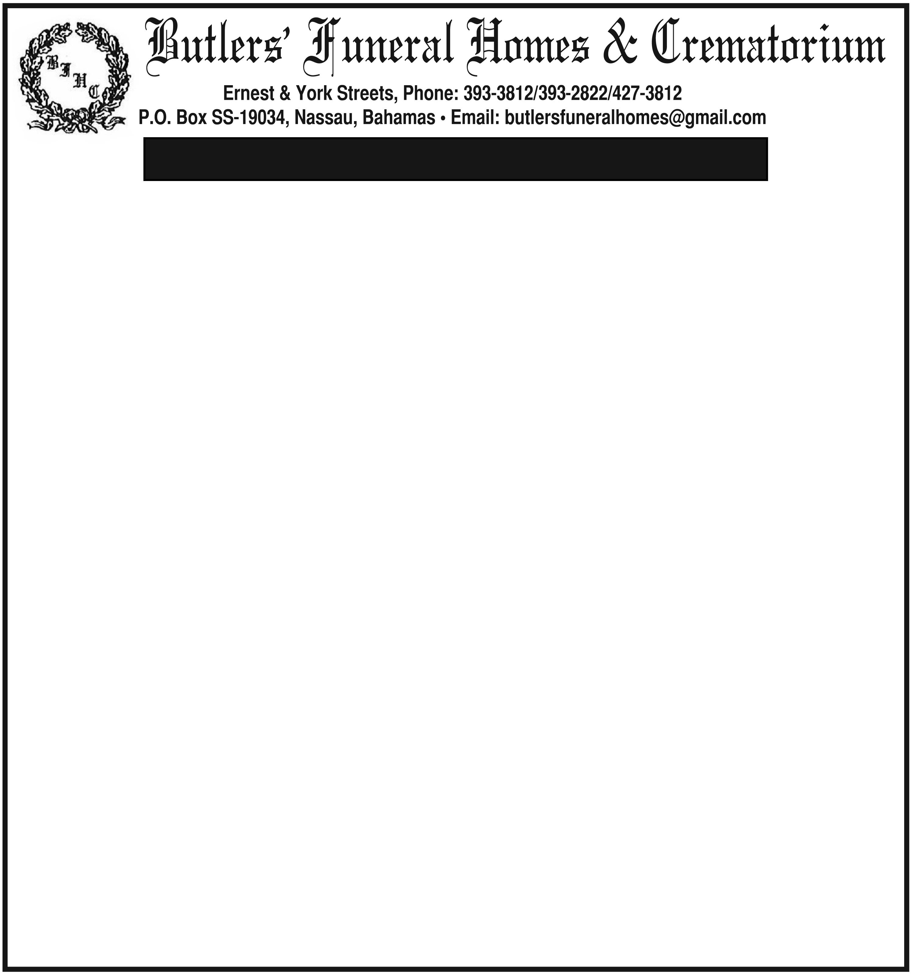 Viewing will be held in the “Celestial Suite” at Restview Memorial Mortuary and Crematorium Limited, #11-A Coral Road, Freeport, Grand Bahama on Friday from 10:00 a.m. to 5:00 p.m.