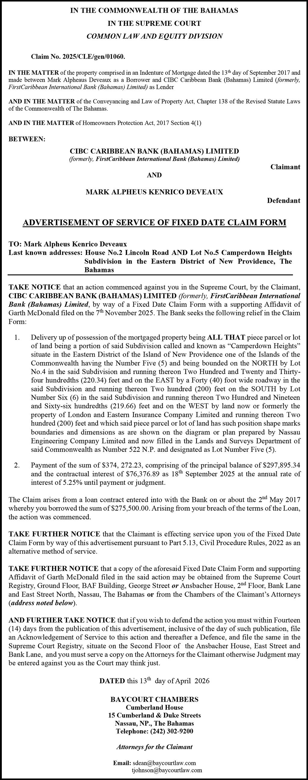 NOTICE is hereby given that I OMAR ROBERT BRYAN of, Coral Harbour, New Providence, Bahamas, applying to the Minister responsible for Nationality and Citizenship, for Registration Naturalization as a citizen of The Bahamas, and that any person who knows any reason why registration/ naturalization should not be granted, should send a written and signed statement of the facts within twenty-eight days from the 15th day of April, 2026 to the Minister responsible for nationality and Citizenship, P.O. Box N-7147, Nassau, New Providence, The Bahamas.