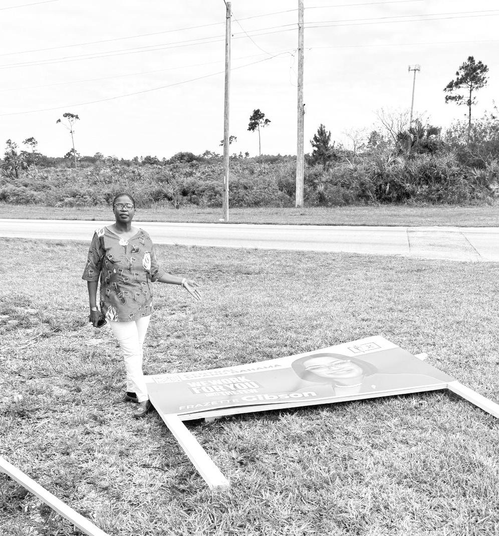 Frazette Gibson, the FNM candidate for Central Grand Bahama, said she found one of her signs on Santa Maria Drive knocked to the ground early Wednesday, with the billboard’s supporting leg broken. She said a billboard belonging to Paco Deal, the PLP candidate for the constituency, was also defaced in the same area.