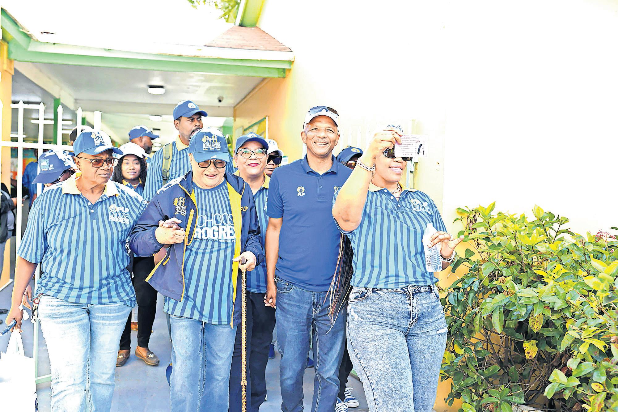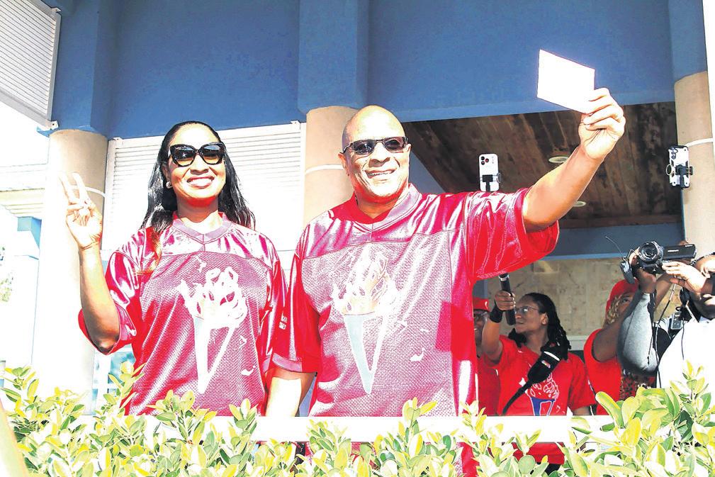 Free National Movement candidate Michela Barnett-Ellis arrived at Gambier Primary School with dozens of supporters dressed in red, including her