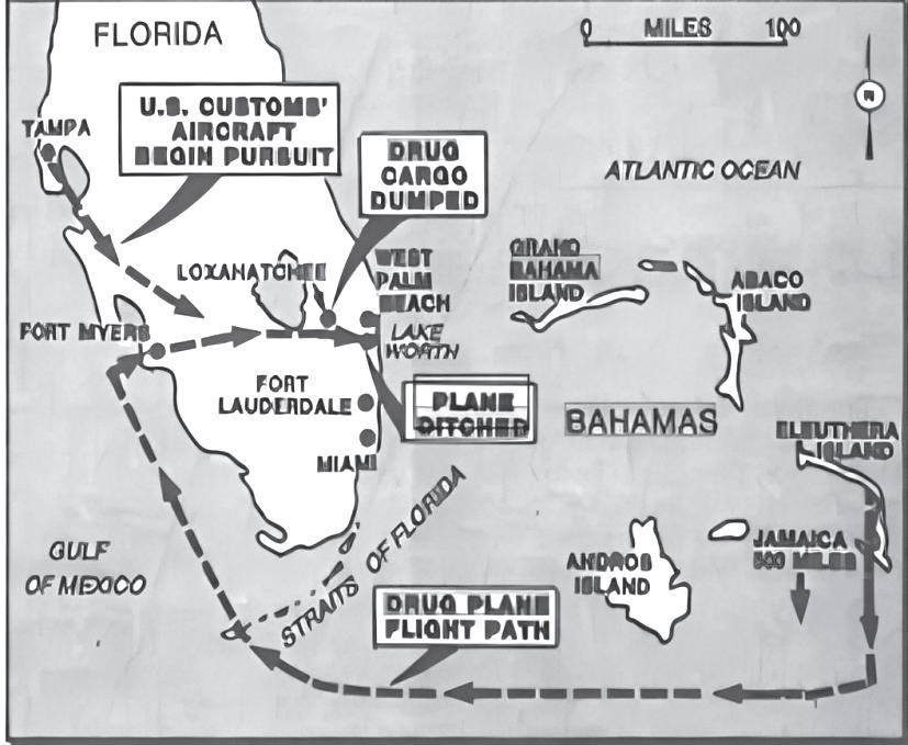 in Eleuthera laden with 750 pounds, filed a flight plan for Jamaica. But instead, they flew west, south of Andros, to the Florida Keys, then east to Palm Beach, where they ditched the twin-engine Cessna 337 into the Intracoastal Waterway at Loxahatchee, near Palm Beach. They were arrested by the DEA who had been following them.