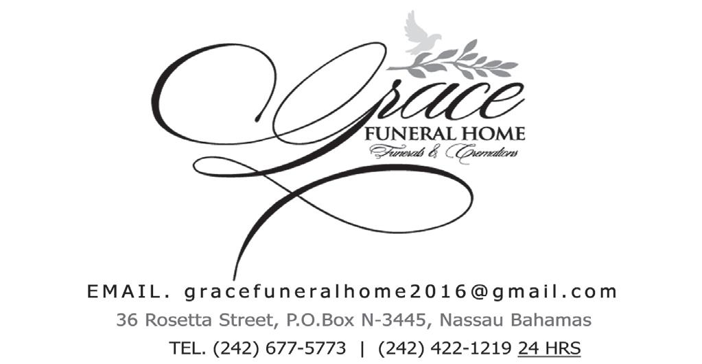 Left to cherish his memories are his, children, Daughters: Kelsie Sands and Sonia Ferguson; Sons: Eric Ferguson Jr., and Brian Ferguson; Grandchildren: Anitra Bastian, Anthonica, Bryanna, Byria and Dave Adderley, Jamie Sands, Brian and Jayden; Great Grandchildren: Amaria and Mario Brown, Delvano Adderley, Breon Knowles; Sister: Evangelist Helen Johnson of Florida; Brother: Cedric Deveaux; Nieces: Tamara McCray, Shavonne Gilbert, Yvette Bowers, Jestina Cox, Tahirah Knowles and Racquel Deveaux; Nephews: Minister Terry Styles, Trevor Styles, Jermaine Williams, Alfaro Deveaux and Sherief Ferguson; Daughter-in-law: Terry Ferguson; Sisters-inLaw: Hattiemae Deveaux and Brenda Ferguson; Other Relatives and Friends including: Karen Ferguson (Ira Ferguson, Junior’s Wife), Hon. V. Alfred Gray, Pastor Garon Williamson of Joshua Kingdom Ministries and the entire Church Family, Crystal Styles, Minister Benjamin Gray and Family, Shirley Williams, Dr. Jane Styles, Darnell Styles, Rosa Styles, Clarence Styles Jr., Latoya Williamson, Julia, Ashley, Rosalyn, Valarie and Family, Anthony Johnson, Shaqueal, Alfreda Mills, Stephen, Roston Cox, Dr. C.B. Moss and Family, Mabel Higgs and Family, Margaret Dillet and Family, Wilfred Hanna and Family, Sydney Darling and Family, Kenneth Rolle and Family, Chreena Johnson and Family, James Seymour and Family, Lugia Adderley and Family, Community of Chester’s Bay and the entire Community of Acklins.