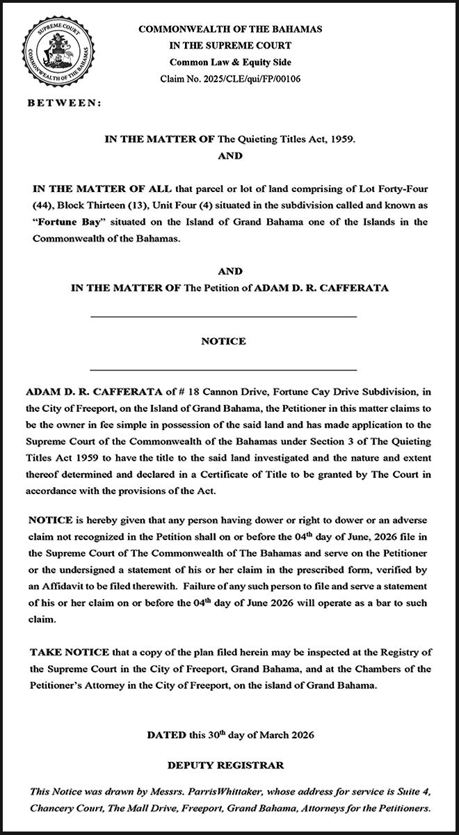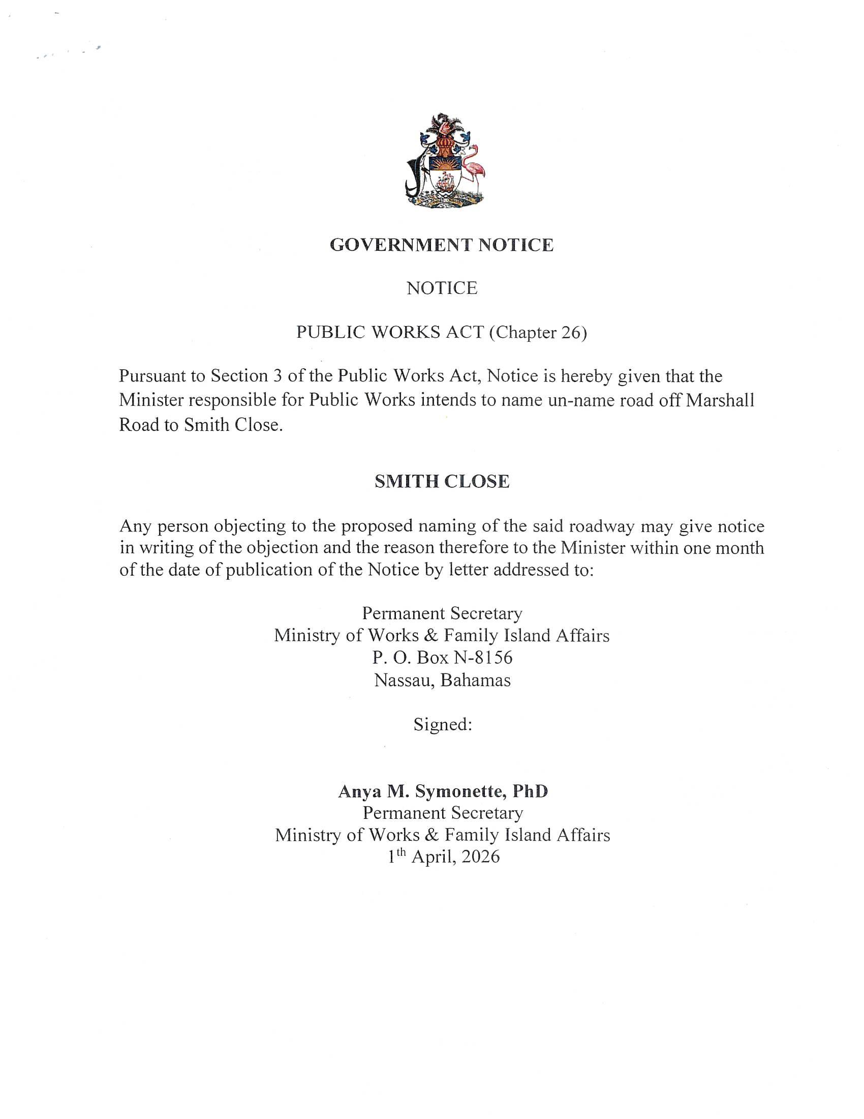 New Providence, Bahamas, applying to the Minister responsible for Nationality and Citizenship, for Registration Naturalization as a citizen of The Bahamas, and that any person who knows any reason why registration/ naturalization should not be granted, should send a written and signed statement of the facts within twenty-eight days from the 13th day of April, 2026 to the Minister responsible for nationality and Citizenship, P.O. Box N-7147, Nassau, New Providence, The Bahamas.
