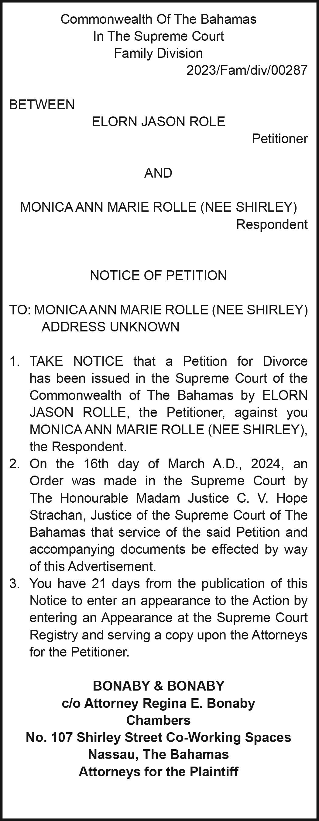 Street, New Providence, Bahamas, applying to the Minister responsible for Nationality and Citizenship, for Registration Naturalization as a citizen of The Bahamas, and that any person who knows any reason why registration/naturalization should not be granted, should send a written and signed statement of the facts within twentyeight days from the 13th day of April, 2026 to the Minister responsible for nationality and Citizenship, P.O. Box N-7147, Nassau, New Providence, The Bahamas.