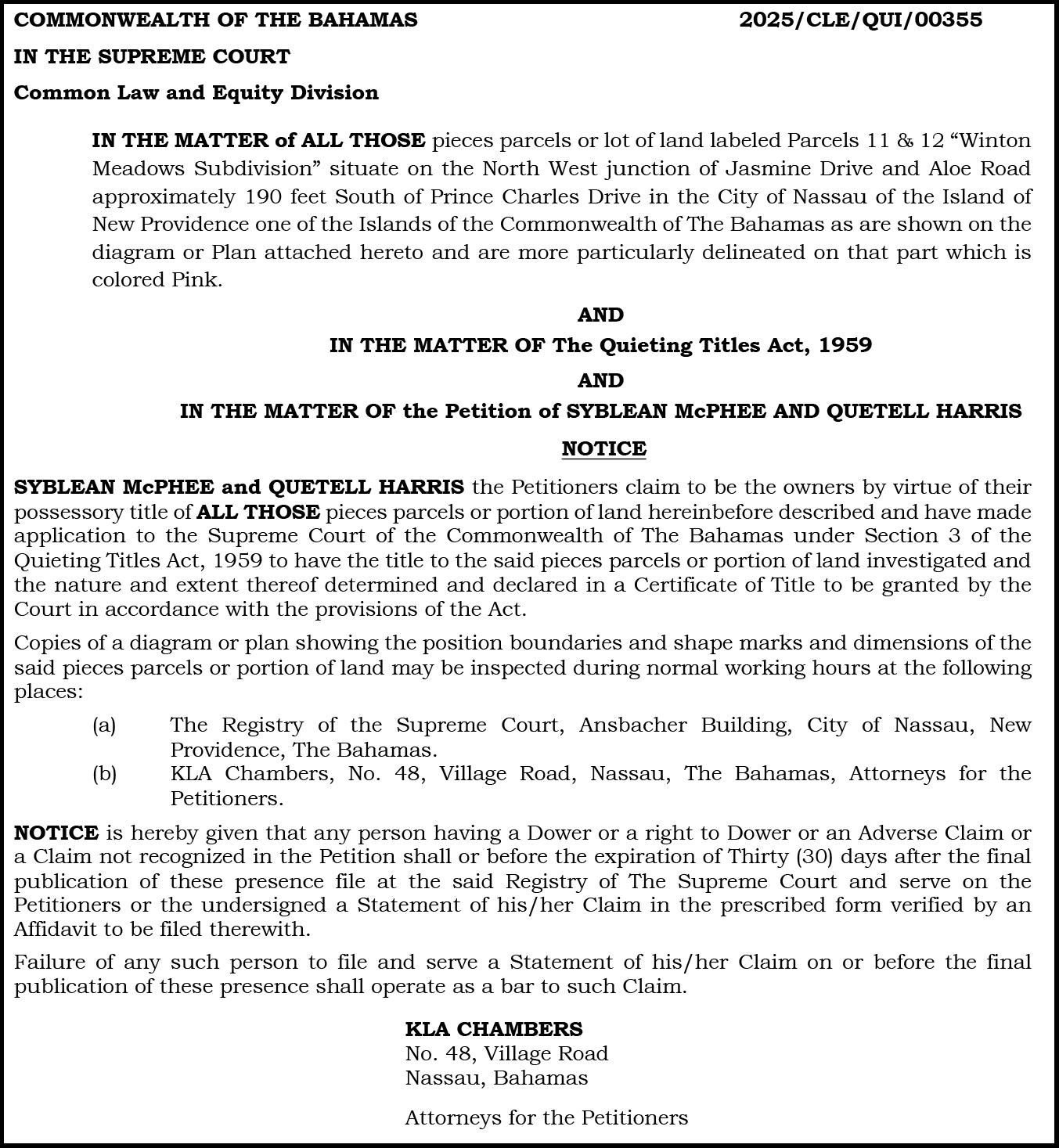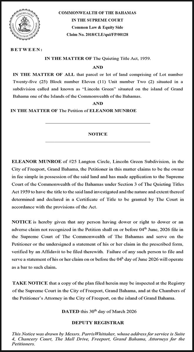 NOTICE is hereby given that I MARIE-NICOLE LAFLEUR of, Union Village, New Providence, Bahamas, applying to the Minister responsible for Nationality and Citizenship, for Registration Naturalization as a citizen of The Bahamas, and that any person who knows any reason why registration/naturalization should not be granted, should send a written and signed statement of the facts within twenty-eight days from the 13th day of April, 2026 to the Minister responsible for nationality and Citizenship, P.O. Box N-7147, Nassau, New Providence, The Bahamas.