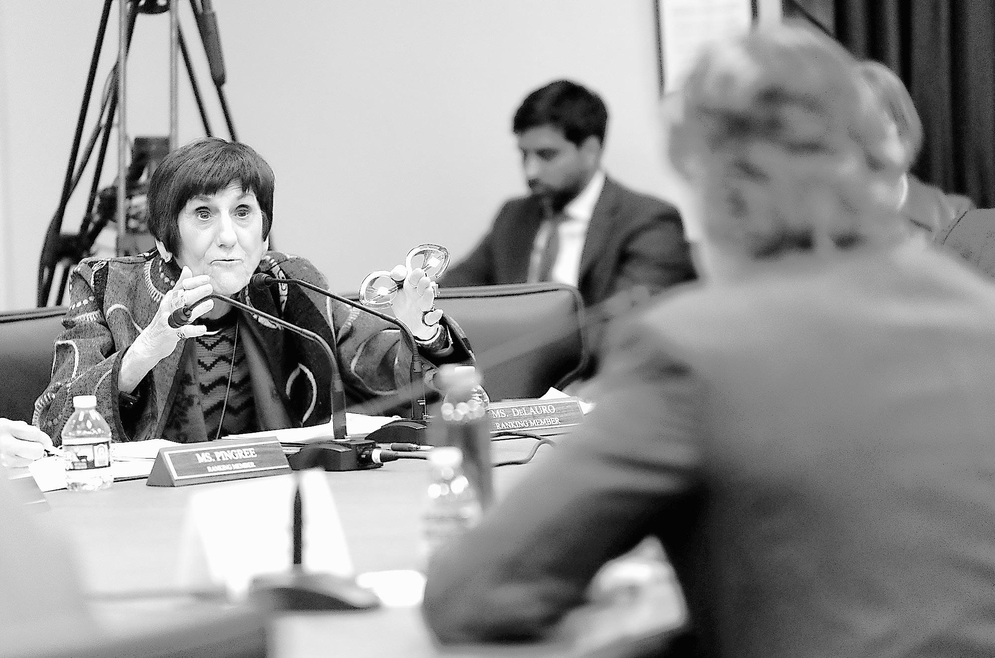 HOUSE Appropriations Committee ranking member Rosa DeLauro, D-Conn., left, questions Interior Secretary Doug Burgum, right, during the committee’s budget hearing on Capitol Hill, Monday, April 20, 2026, in Washington.