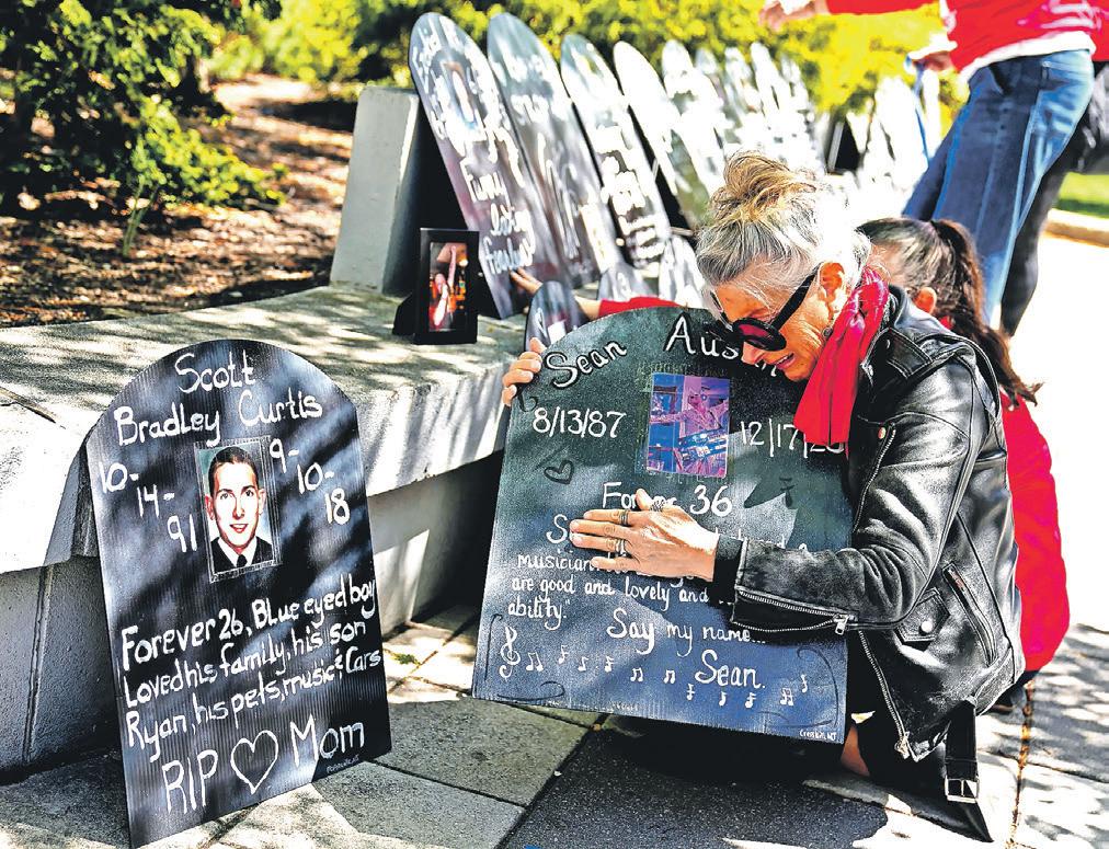 TANNY Austin cries while looking at tombstones with the names of victims of the opioid crisis, including her son Sean Austin, during a rally outside of a courthouse in Newark, N.J., Tuesday, April 21, 2026.