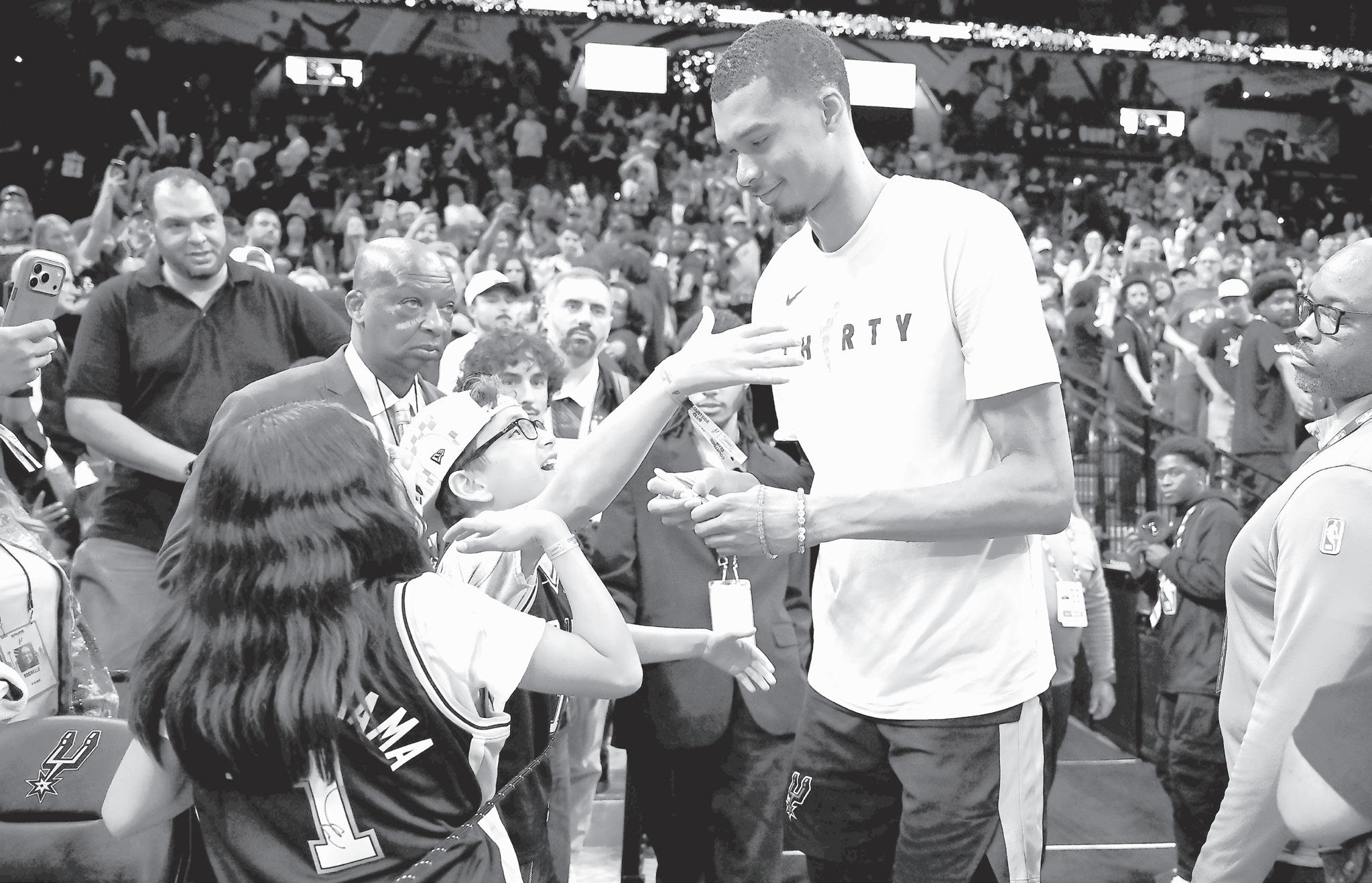 VICTOR Wembanyama, centre right, greets fans after an NBA basketball game against the Dallas Mavericks, Friday, April 10, 2026, in San Antonio. (AP Photo/Darren Abate)