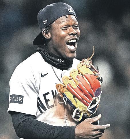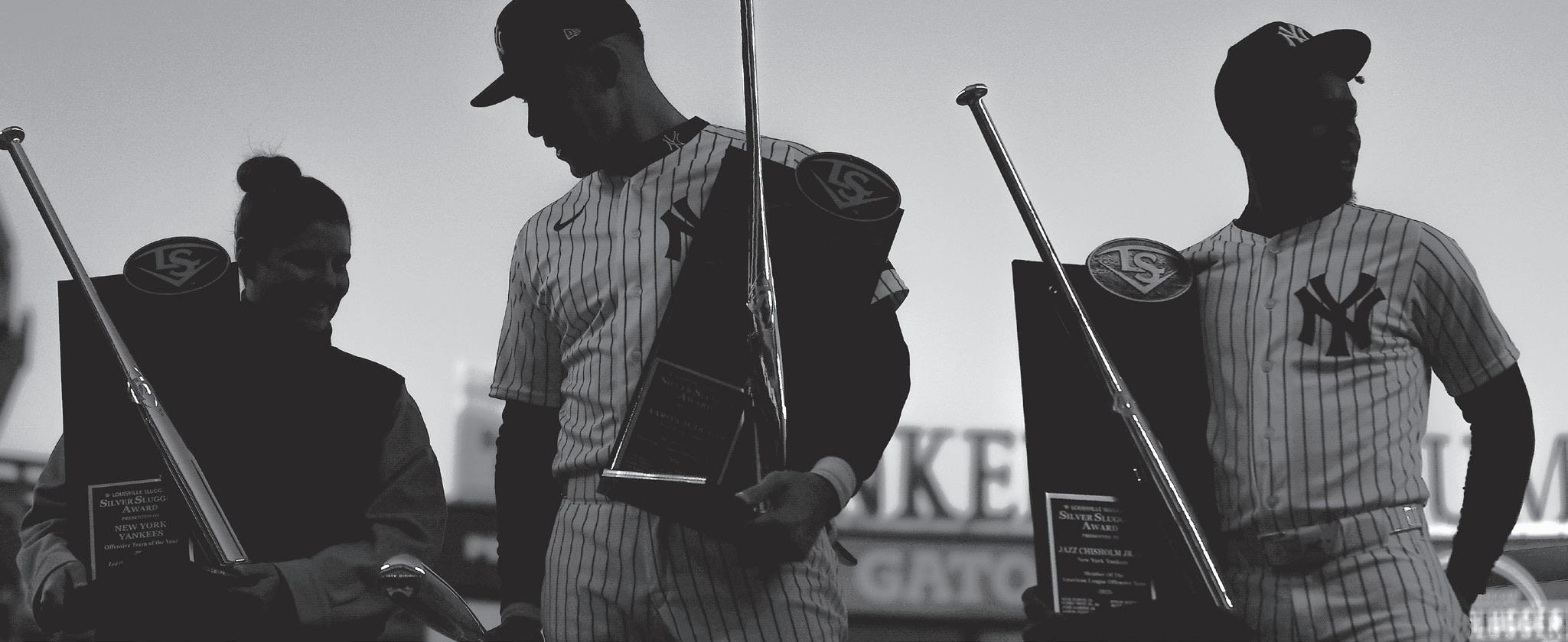 YANKEES outfielder Aaron Judge, centre, and second baseman Jasrado “Jazz” Chisholm Jr., right, receive their Silver Slugger awards before a baseball game against