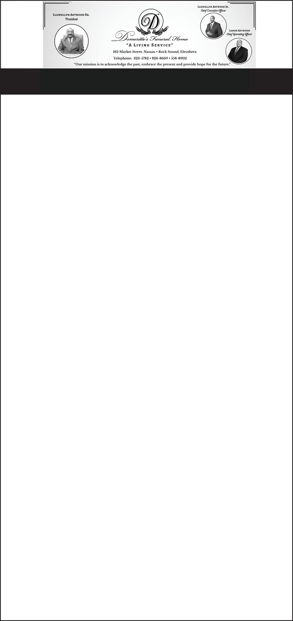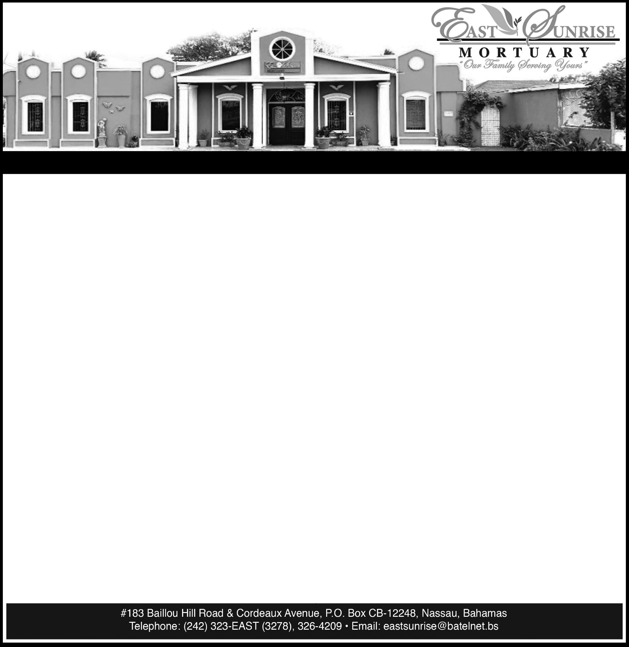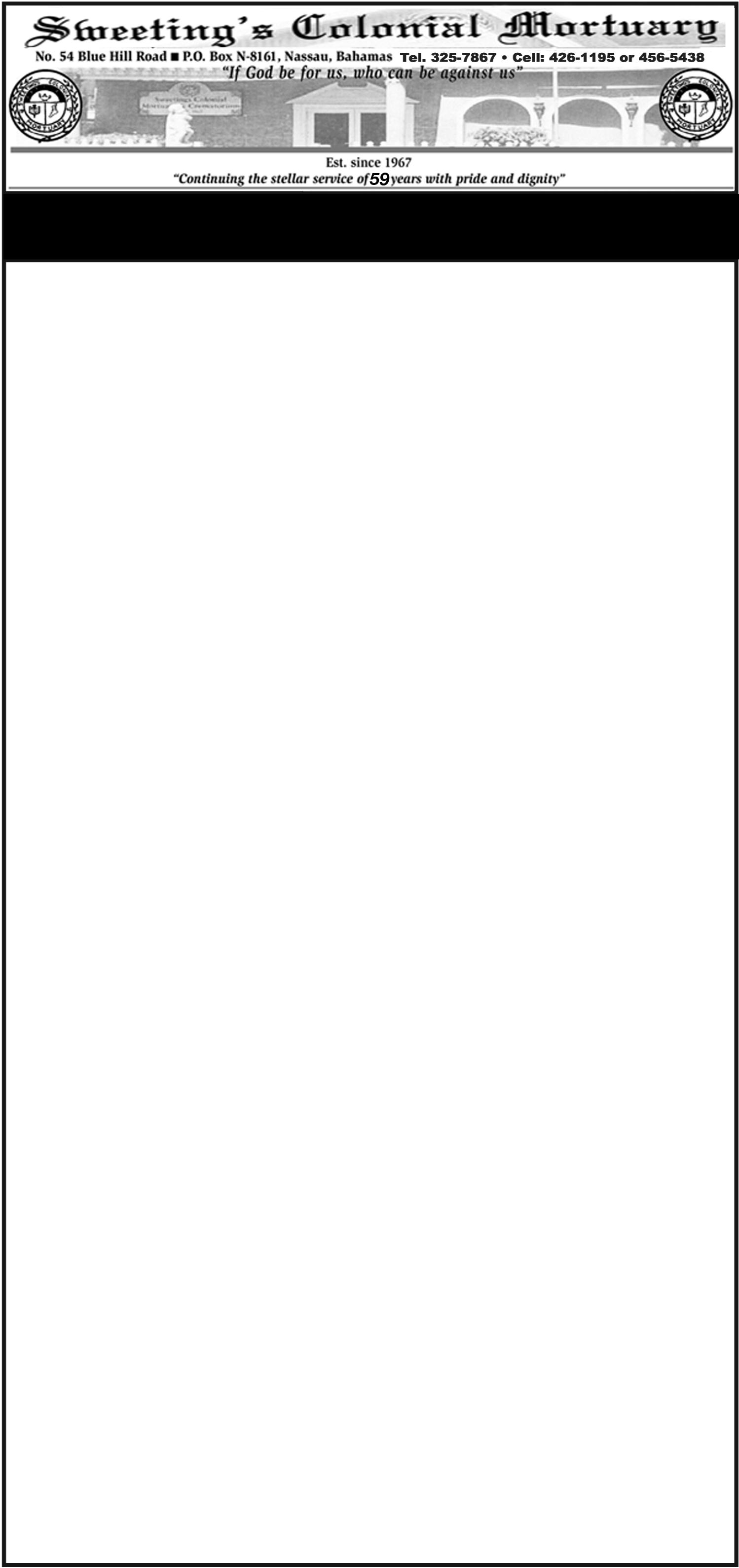 Left to cherish her life and legacy are her beloved and only Child: Marlon Christopher; Sisters: Thelma V. Bowleg-Rolle and Stephanie BowlegMcKenzie; Sisters-in-law: Cheryl, Paula and Fern Bowleg; Brother-inlaw: Richard Bonamy; Nieces and their spouses: Constance Seymour (Greg), Lesley Rahming (Ryan), Chanti and Brigitta Seymour, Patrice Hall (William) and Toni McPhee (DeCarlo), Cherise Adgar, Simone Rolle-Graham (Jhomo) and Sophie Rolle-Kapasouzouglou (Costas); Kimberley and Anita Bowleg; Nephews and their spouses: Kenneth, Stephen and Hans Seymour; Kevin Bowleg (Tamika); Marcian, Michael and Mario (Dr. Lancia) Bowleg; Etienne Bowleg; Jamin Bowleg; Simon Crispin Rolle; Alton (Dr. Carlyne) and Stephan McKenzie; Anthon Bowleg. Grandnieces: Jeané Swann and Shonell Mortimer (Jamal), Jasmine and Janice McDonald, Benyanique, Kendranique, Makeda and Kenya Seymour; Kevon and Kiane Bowleg; Anaiah and Amira Bowleg; Zuri Nixon; Lashae Sampson; Amayah Bowleg; A’mari Bowleg; Milah Bowleg; Ryan-Simmone Rahming; Racquel Hall; Micah Graham; Casmine McKenzie; Haris Kapasouzouglou; Grandnephews: Rico (Maxine) Seymour; Miguel Swann; Joshua Beer; Clement, Kenneth and Judah Seymour; Dylan McPhee; Ethan Hall; Jaleel Bowleg; Malachi Graham; Daniel and Jonathan Adgar; Hugh and Aamari Bowleg; Kymani Symonette; Lavan Sampson. Numerous Great-grandnieces and Great-grandnephews including: Omar Adderley; Rica, Renae and Rachel Seymour; Jamarri and Saniya Mortimer. Cousins: Ellis Peet and family; Sylvia Russell and family; Clyde, Charles, Jimmy and Hilda Bowleg and families; Ruth Outten, Paul King, Dora Bethel and families; Octavia Johnson, Gladys Sands and families; descendants of Firstina Hepburn; descendants of Osbourne, Garnett, Harlod and Husein King; descendants of Arthur King: Bradley King, Vanria Davis, Ernestine King, Dorothy Miller, Brenda King, Bruno-Gaston, Sandra Storr and families; John King; Hilton Bowleg and family; Bernadette Johnson and family; descendants of Alfred King; Michelle Adderley and family; descendants of Pearl Cox; descendants of Ida