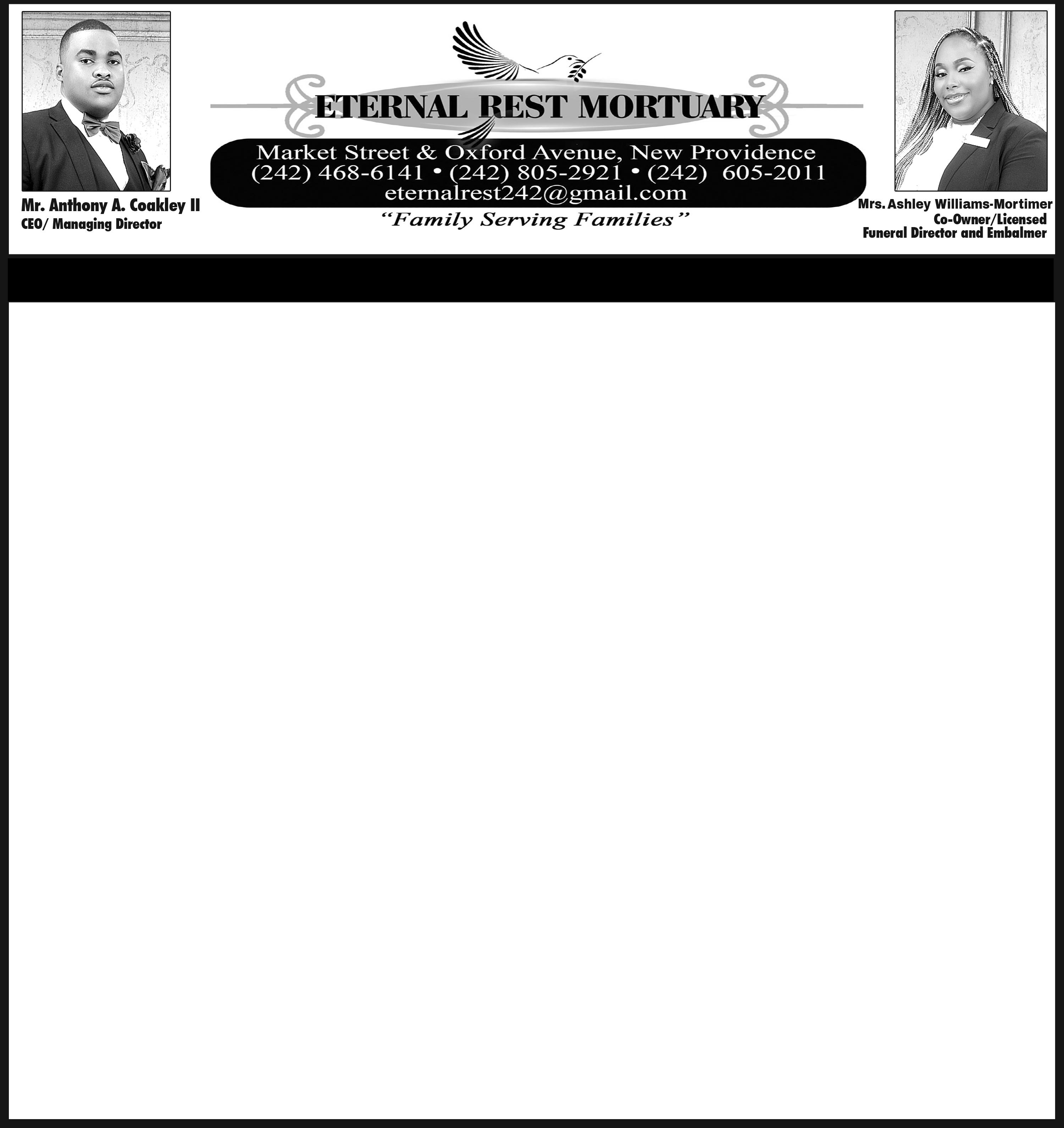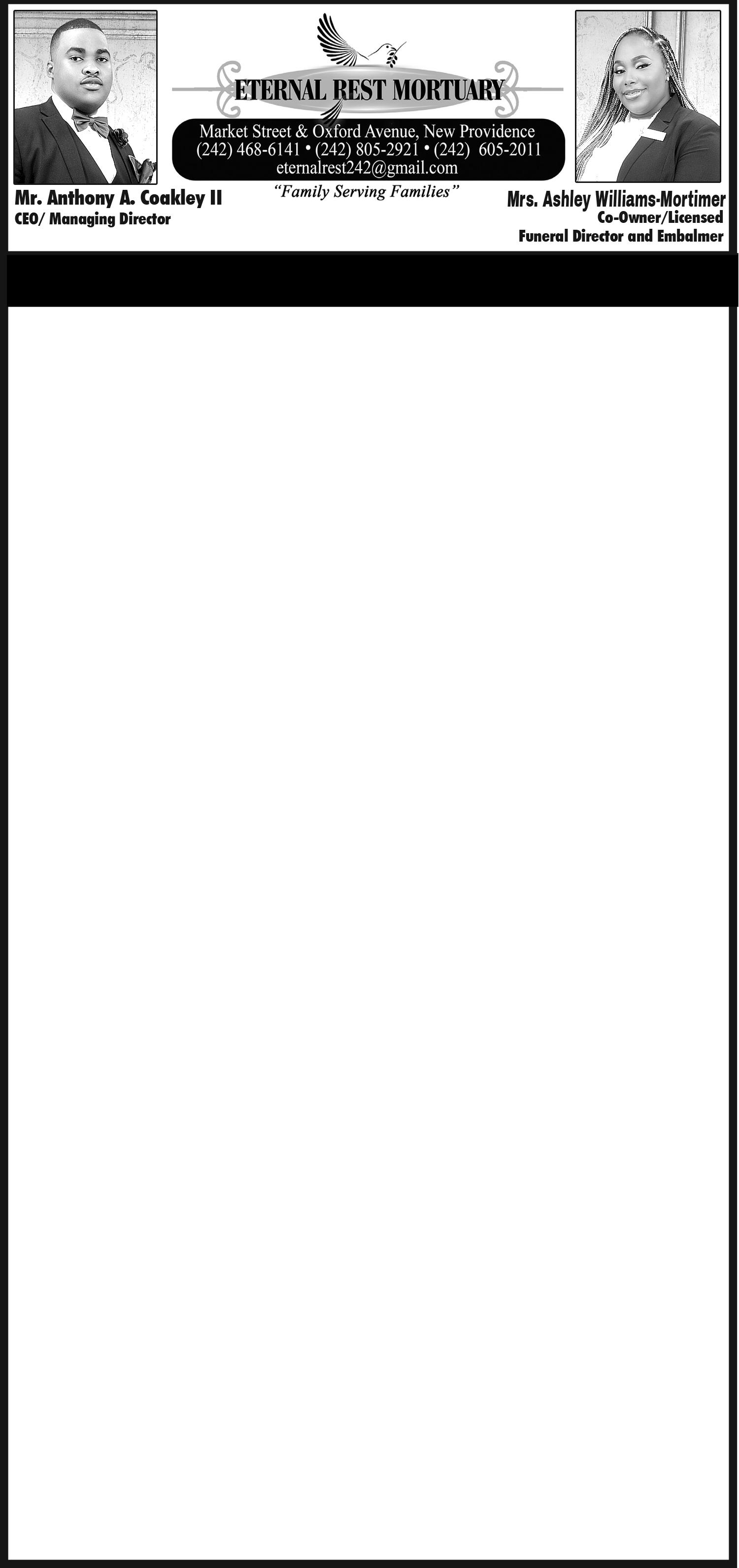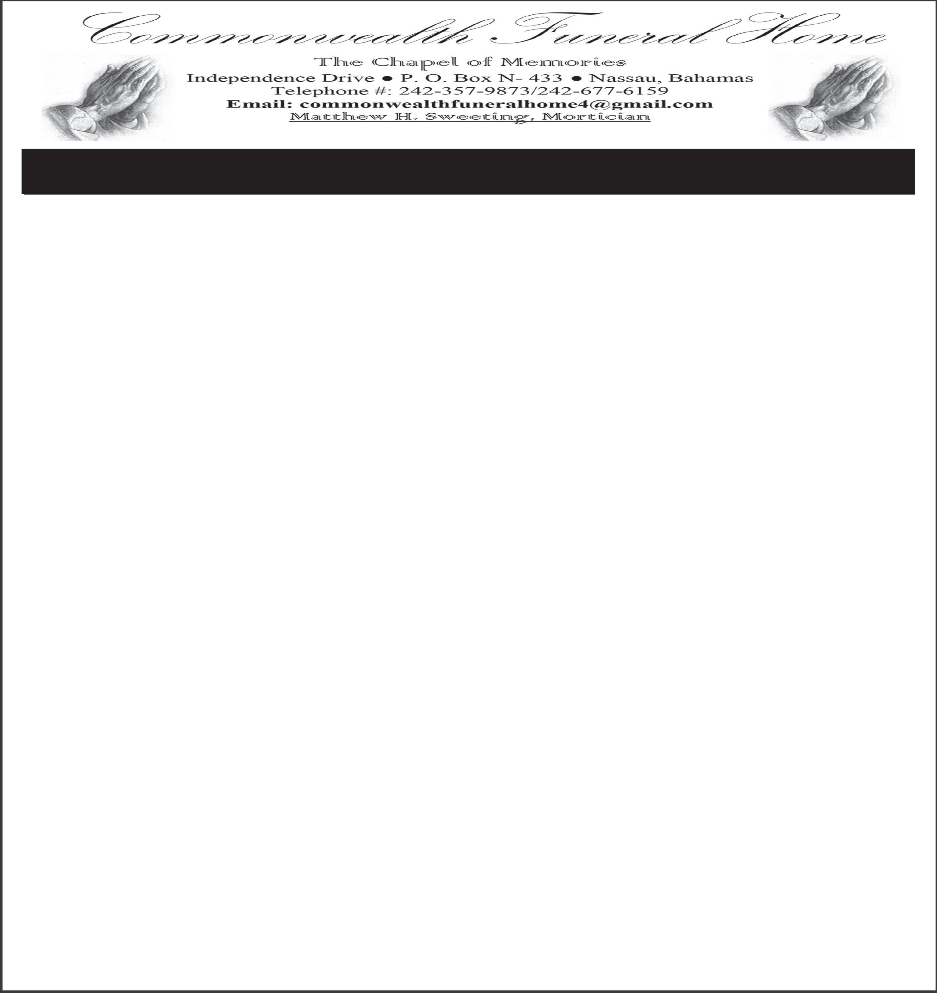 Left to cherish her life and legacy are her beloved and only Child: Marlon Christopher; Sisters: Thelma V. Bowleg-Rolle and Stephanie BowlegMcKenzie; Sisters-in-law: Cheryl, Paula and Fern Bowleg; Brother-inlaw: Richard Bonamy; Nieces and their spouses: Constance Seymour (Greg), Lesley Rahming (Ryan), Chanti and Brigitta Seymour, Patrice Hall (William) and Toni McPhee (DeCarlo), Cherise Adgar, Simone Rolle-Graham (Jhomo) and Sophie Rolle-Kapasouzouglou (Costas); Kimberley and Anita Bowleg; Nephews and their spouses: Kenneth, Stephen and Hans Seymour; Kevin Bowleg (Tamika); Marcian, Michael and Mario (Dr. Lancia) Bowleg; Etienne Bowleg; Jamin Bowleg; Simon Crispin Rolle; Alton (Dr. Carlyne) and Stephan McKenzie; Anthon Bowleg. Grandnieces: Jeané Swann and Shonell Mortimer (Jamal), Jasmine and Janice McDonald, Benyanique, Kendranique, Makeda and Kenya Seymour; Kevon and Kiane Bowleg; Anaiah and Amira Bowleg; Zuri Nixon; Lashae Sampson; Amayah Bowleg; A’mari Bowleg; Milah Bowleg; Ryan-Simmone Rahming; Racquel Hall; Micah Graham; Casmine McKenzie; Haris Kapasouzouglou; Grandnephews: Rico (Maxine) Seymour; Miguel Swann; Joshua Beer; Clement, Kenneth and Judah Seymour; Dylan McPhee; Ethan Hall; Jaleel Bowleg; Malachi Graham; Daniel and Jonathan Adgar; Hugh and Aamari Bowleg; Kymani Symonette; Lavan Sampson. Numerous Great-grandnieces and Great-grandnephews including: Omar Adderley; Rica, Renae and Rachel Seymour; Jamarri and Saniya Mortimer. Cousins: Ellis Peet and family; Sylvia Russell and family; Clyde, Charles, Jimmy and Hilda Bowleg and families; Ruth Outten, Paul King, Dora Bethel and families; Octavia Johnson, Gladys Sands and families; descendants of Firstina Hepburn; descendants of Osbourne, Garnett, Harlod and Husein King; descendants of Arthur King: Bradley King, Vanria Davis, Ernestine King, Dorothy Miller, Brenda King, Bruno-Gaston, Sandra Storr and families; John King; Hilton Bowleg and family; Bernadette Johnson and family; descendants of Alfred King; Michelle Adderley and family; descendants of Pearl Cox; descendants of Ida