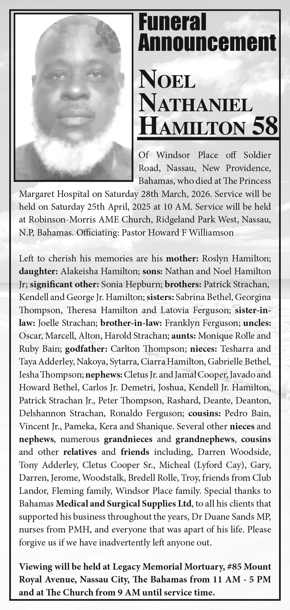 of Strachan’s Alley off Kemp Road , New Providence, Bahamas and formerly of Deep Creek, South Andros) who died at the Princess Margaret Hospital on Saturday, April 4th, 2026 will be held on Saturday, 25th April, 2026 at 10:00am at Pilgrim Baptist Temple, St. James Road off Kemp Road, New Providence. Offciating will be Senior Pastor Leroy Major and other Ministers. Interment will be made in Woodlawn Gardens, Soldier Road, New Providence.