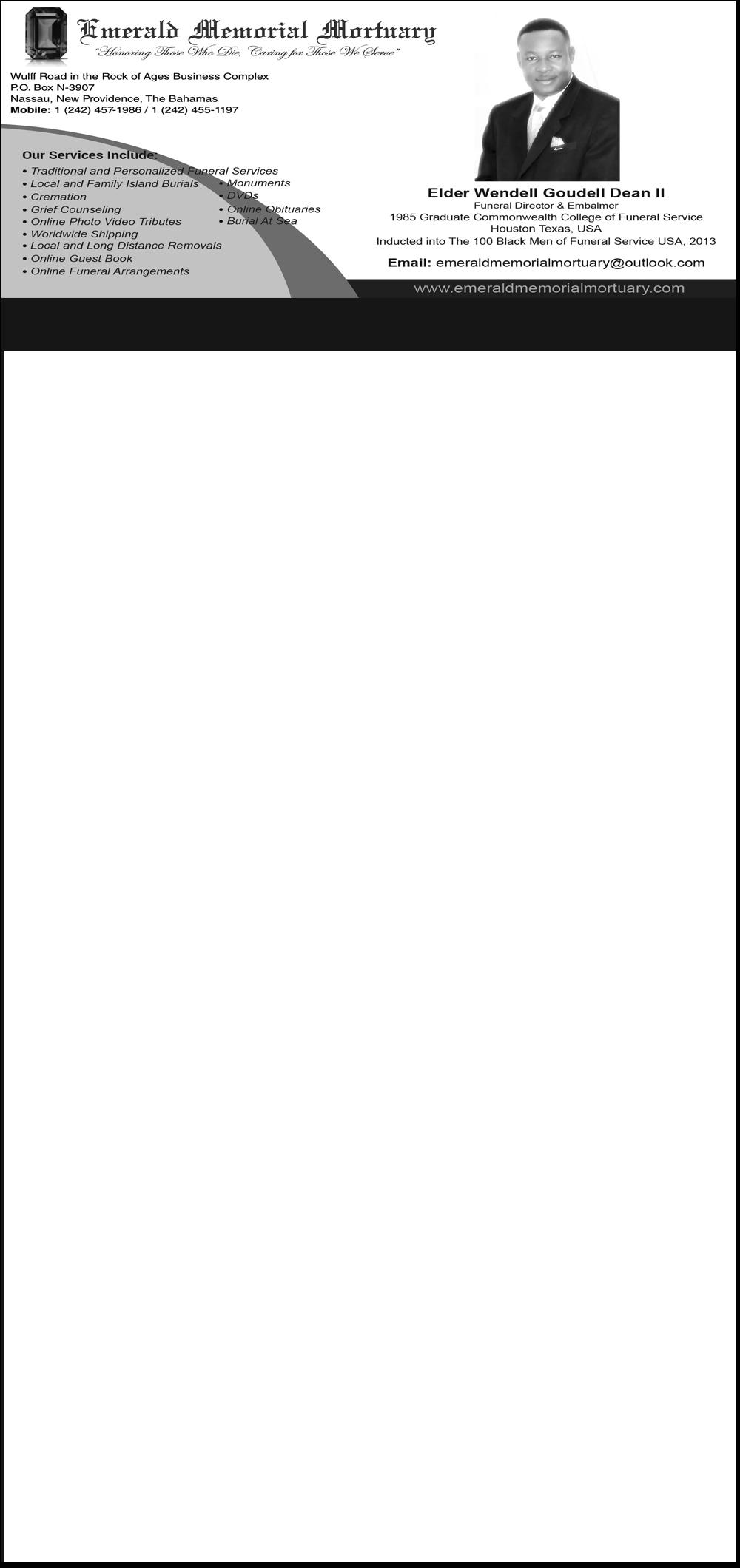 Williams, Doris Cooper, Leese Evans, Pettianne Demeritte and family, Theo Burroughs and family, Celia Ferguson and family, the Brice family, the Thompson Trading family, the Pilgrim Baptist Temple congregation, the communities of Strachan’s Alley, Bay Street Straw Vendors, South Andros, and numerous grandnieces and grandnephews and other relatives and friends.
