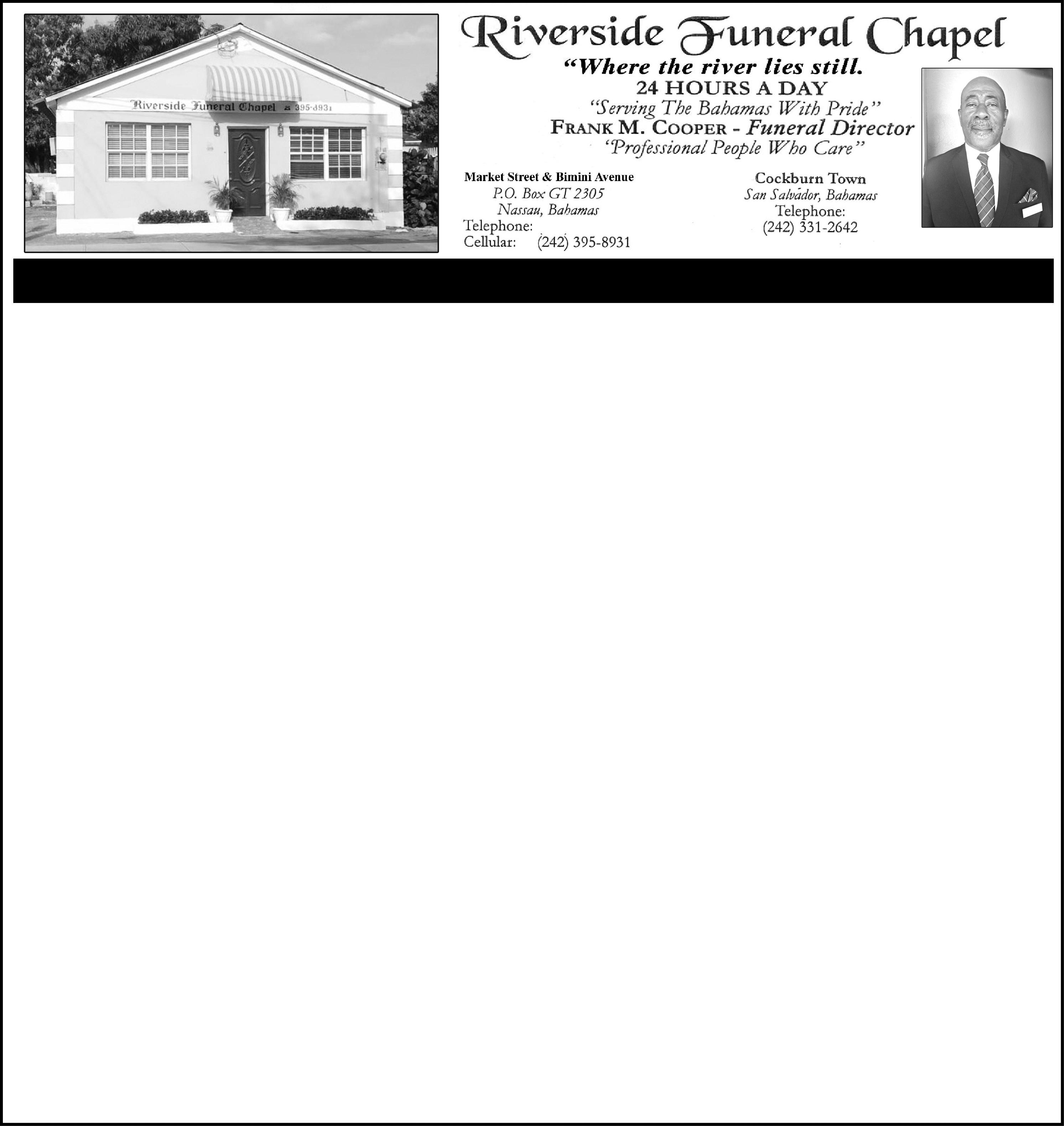Friends may pay their last respects at Riverside Funeral Chapel, Market Street & Bimini Avenue, New Providence on Saturday from 11-5:00 p.m. and on Sunday at the church from 10:00 a.m. until service time.