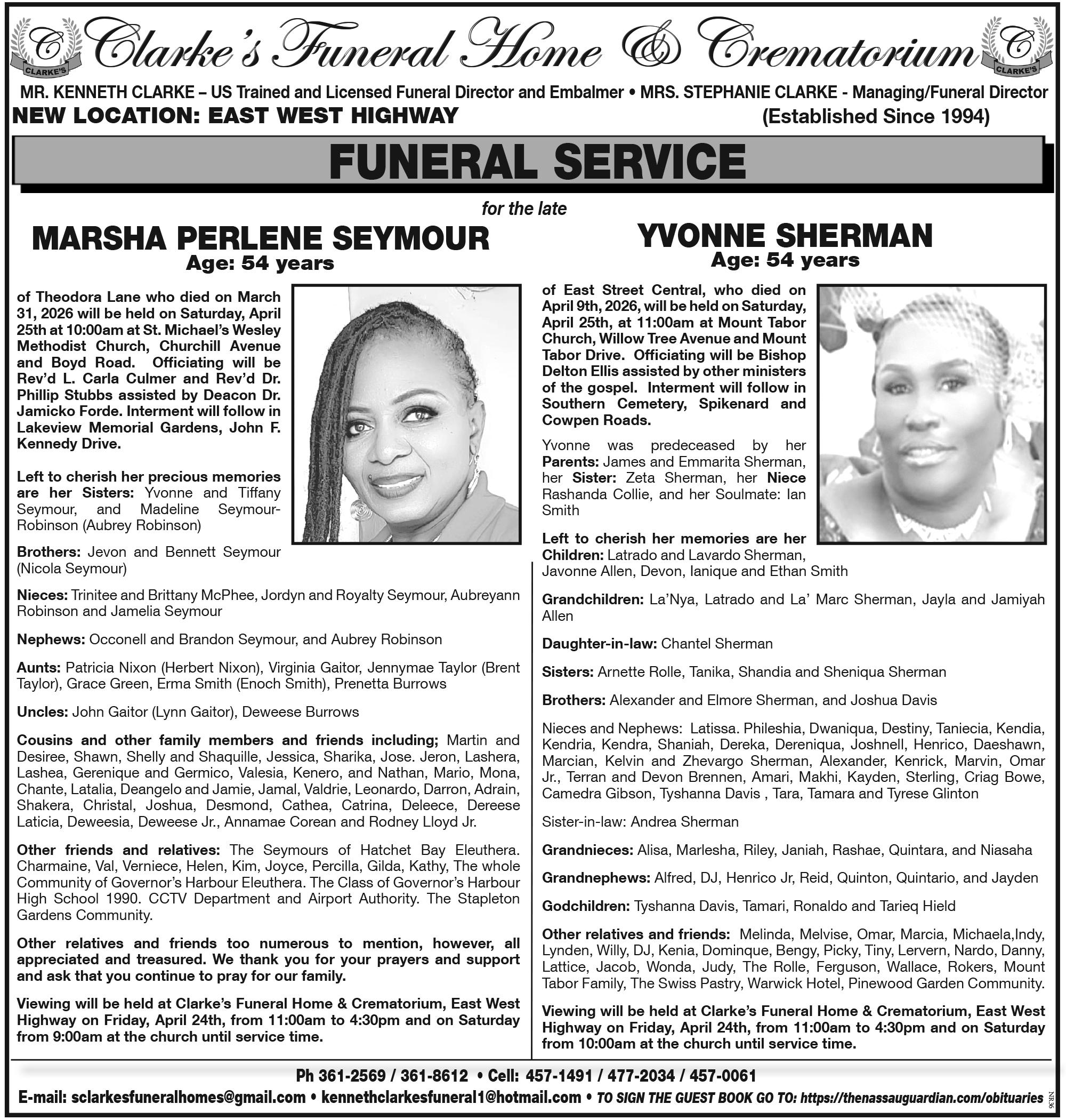 Friends may pay their last respects at Bethel Brothers Morticians and Crematorium, #44a Nassau Street on Thursday (TODAY) 23rd April 2026 from 9:30 a.m. to 5:30 p.m. and at the church on Friday 24th April 2026 from 10:00 a.m. until service time