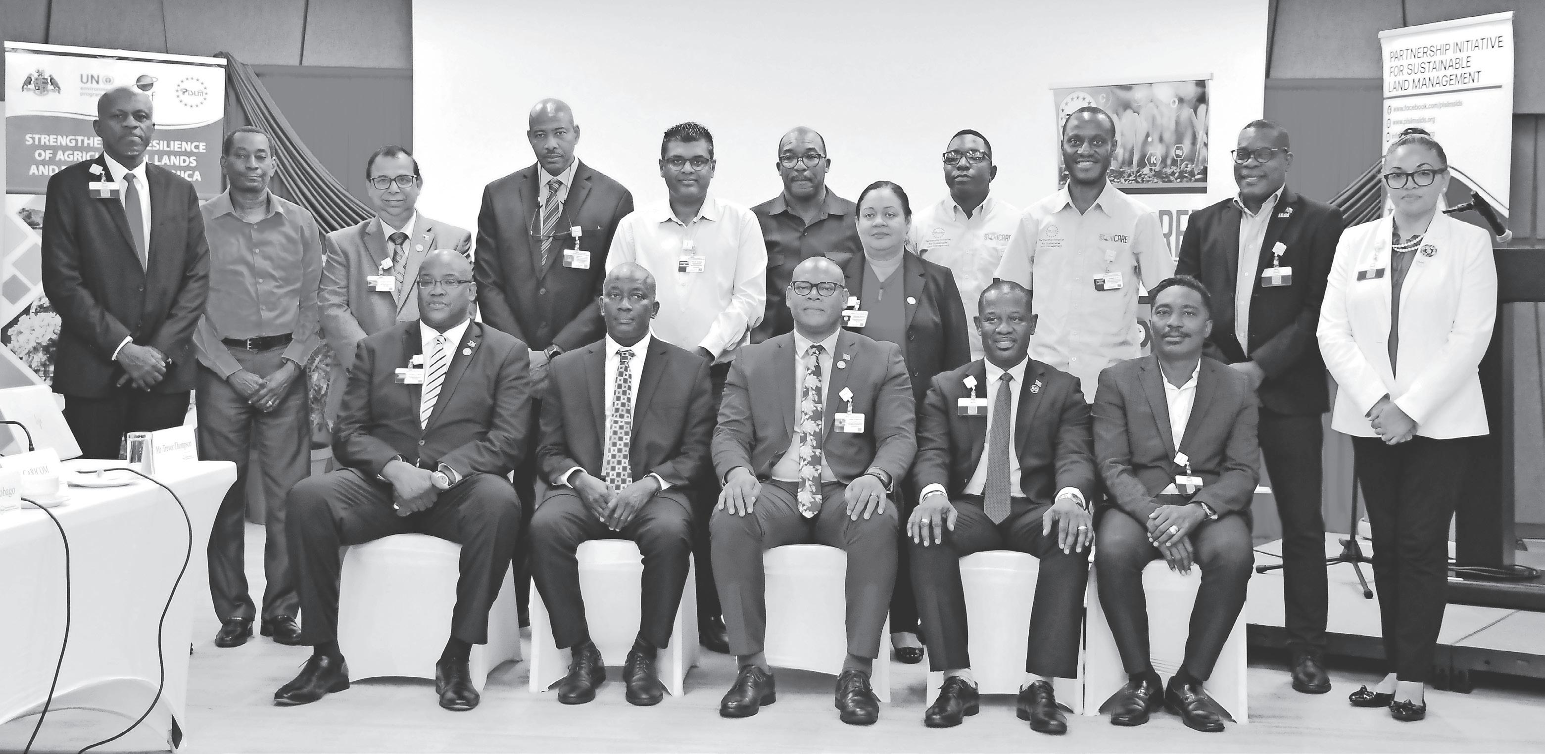 as the United Nations Convention to Combat Desertification and Land Degradation (UNCCD) Political Focal Point for The Commonwealth of The Bahamas. Danielle Hanek, Bahamas Forestry Unit Acting Director, serves as the Technical Focal Point. They travelled to Grenada to participate in the meeting and witness the establishment of PISLM as an intergovernmental organisation during a signing ceremony of the three sponsor countries: Commonwealth of Dominica, Grenada and St Lucia. FROM left (standing) Steve DevonishCSIDS SOILCARE focal point Barbados; Dr Eric Browne UNCCD Focal Point SKN, Enrique Monize, Commissioner Guyana Lands and Survey Commission; Alwin Dornelly, UNCCD Focal Point St Lucia; Ritesh Sardjoe, Suriname Permanent Secretary; Fitzgerald Providence - UNCCD Focal Point SVG; Michelle Alveraz, UNCCD Focal Point Belize; Oraine Nurse- UNCCD Focal Point Antigua; Joseph Noel UNCCD Focal Point GND, Edgar Hunter UNCCD Focal Point Dominica, Danielle Hanek, UNCCD Focal Point and Acting Director, Forestry Unit, Bahamas; (seated) Vaughn Miller, Minister of the Environment and Natural Resources, Bahamas; Alfred Prospere, Minister St Lucia; Cozier Fredrick, Minister Dominica; Adrian Thomas, Senator Grenada, Minister Adrian Forde, Minister Barbados.