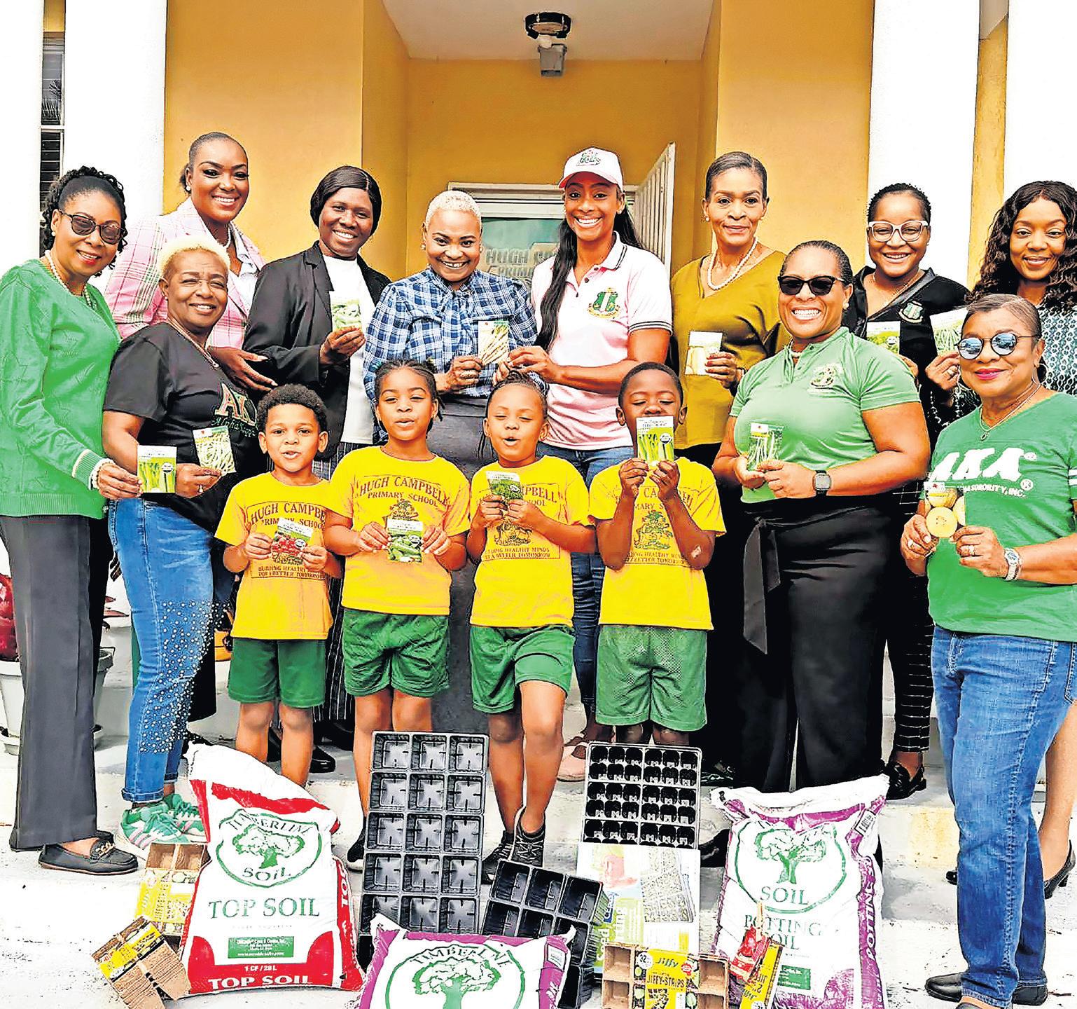 Alpha Kappa Alpha Sorority, Incorporated® Pi Upsilon Omega Chapter donated seeds, planting pots and trays, and soil to the Hugh Campbell Primary School in observance of Earth Day on April 22. Seen are Chapter President Rashema Ingraham (fourth from right), with Principal Tammy Ellis, a teacher (standing fourth and third from left), along with several chapter members and students.