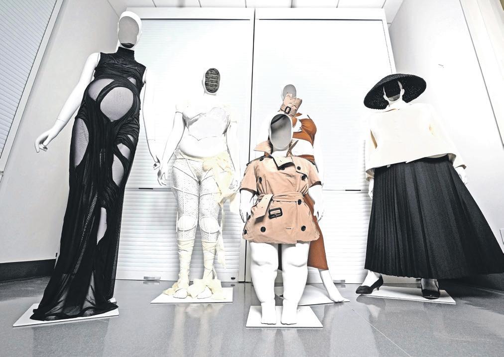 A Di Petsa dress by designer Dimitra Petsa appears on a pregnant mannequin, from left, an ensemble by Michaela Stark on a mannequin in Stark's image, a Burberry ensemble by Christopher Bailey on a mannequin image of Sinéad Burke, foreground, an ensemble by designer Karoline Vitto, on a mannequin model of Charlie Reynolds, and an outfit by designer Maria Grazia Chiuri for the House of Dior on a mannequin model of Yseult, are displayed in a room at the Metropolitan Museum of Art during preparations for the Met Gala exhibit "Costume Art" on Tuesday, April 14, 2026, in New York.