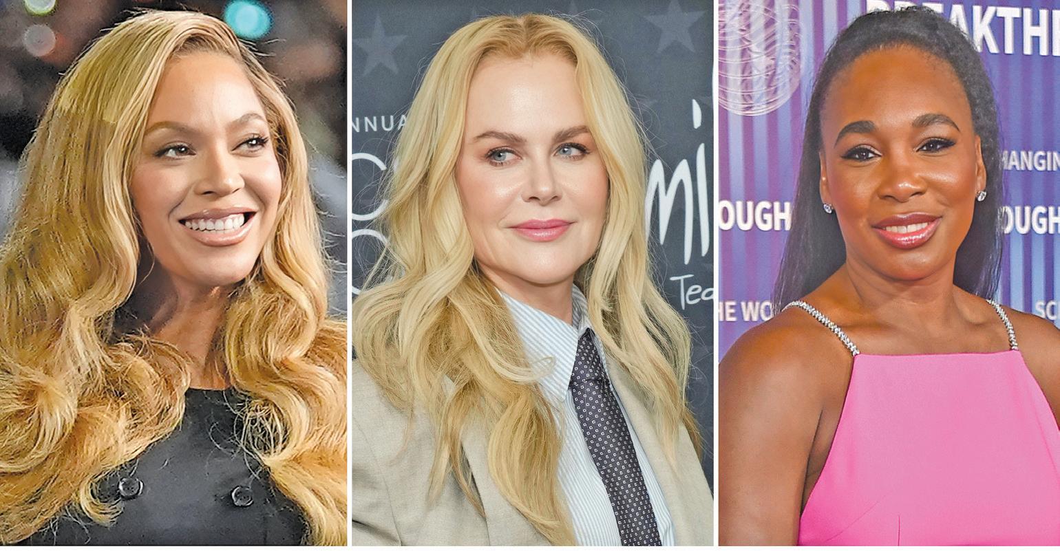 Beyonce appears at a campaign event in Houston, on Oct. 25, 2024, left, Nicole Kidman appears at the 30th Critics Choice Awards Santa Monica, Calif., on Feb. 7, 2025, center, and Venus Williams appears at the 10th Breakthrough Prize Ceremony in Los Angeles on April 13, 2024. AP Photo