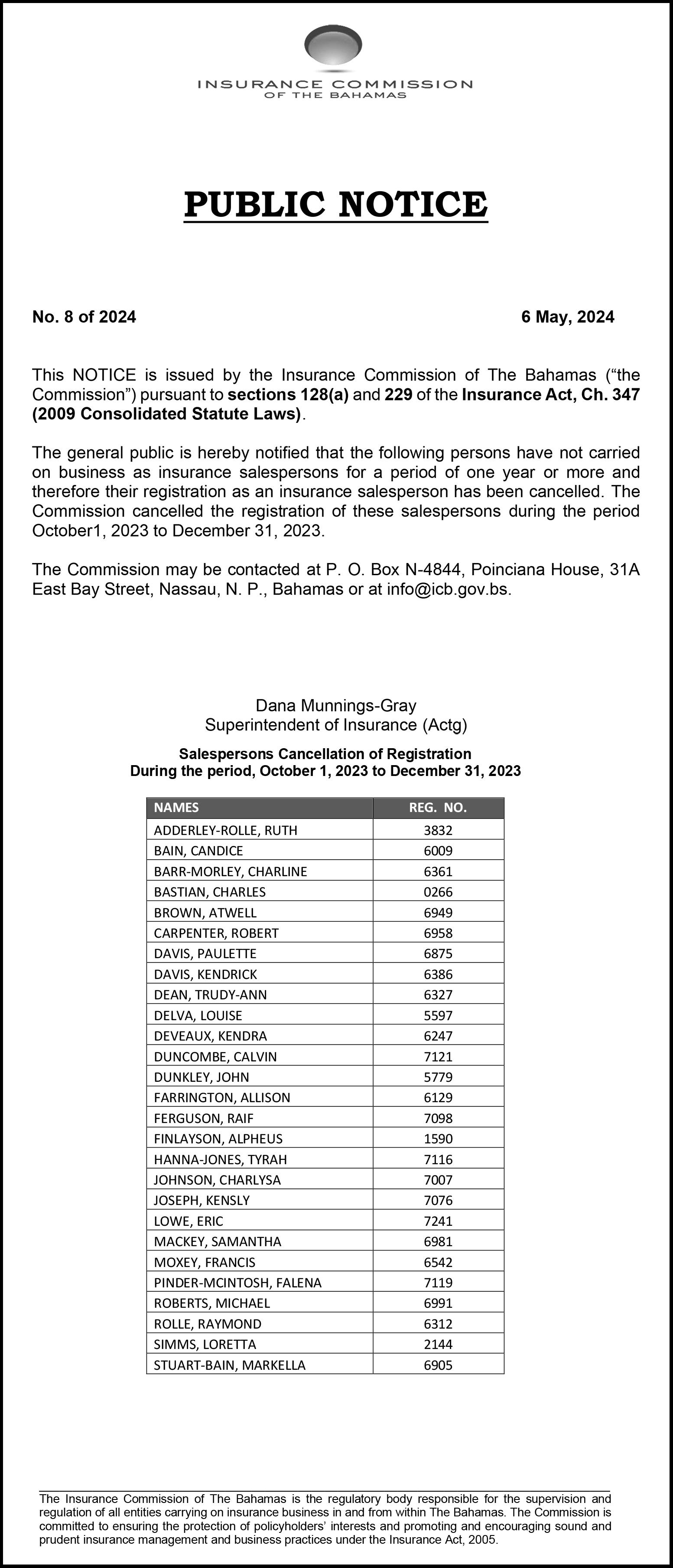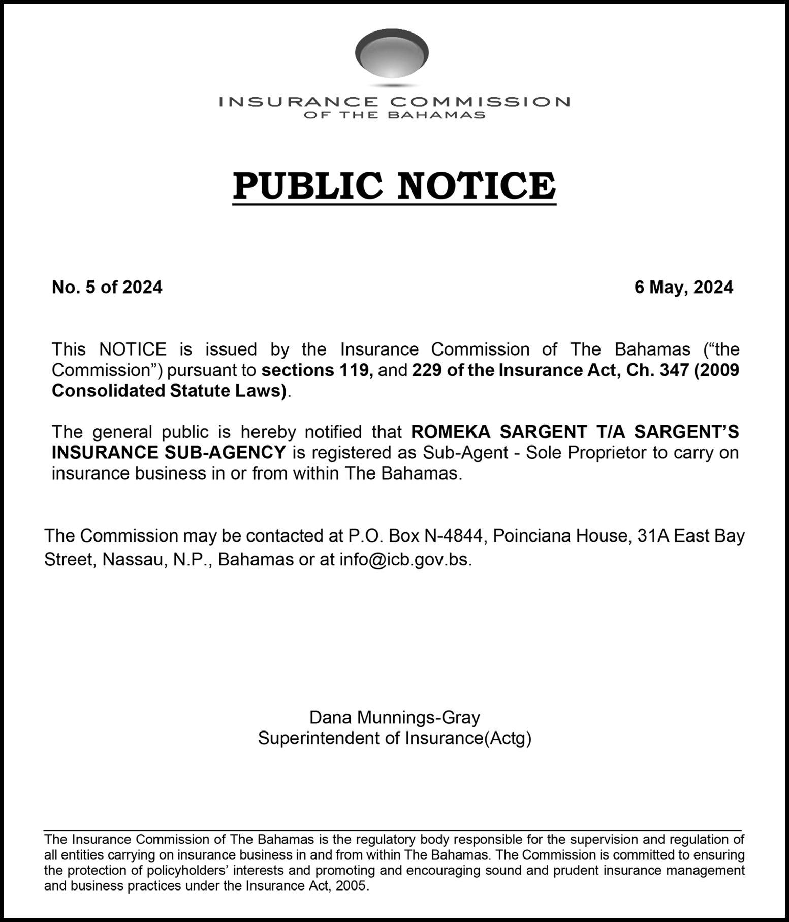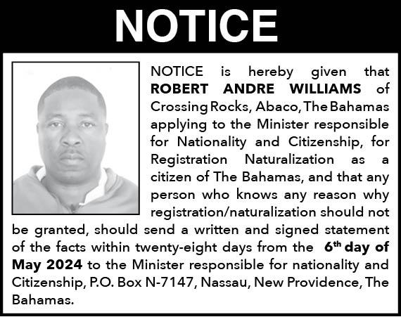 NOTICE is hereby given that MARCIA PAULINE FORBES-SMITH of Faith Avenue, New Providence, The Bahamas is applying to the Minister responsible for Nationality and Citizenship, for registration/ naturalization as a citizen of The Bahamas, and that any person who knows any reason why registration/naturalization should not be granted, should send a written and signed statement of the facts within twenty-eight days from the 29th day of April, 2024 to the Minister responsible for nationality and Citizenship, P.O. Box N-7147, Nassau, Bahamas.