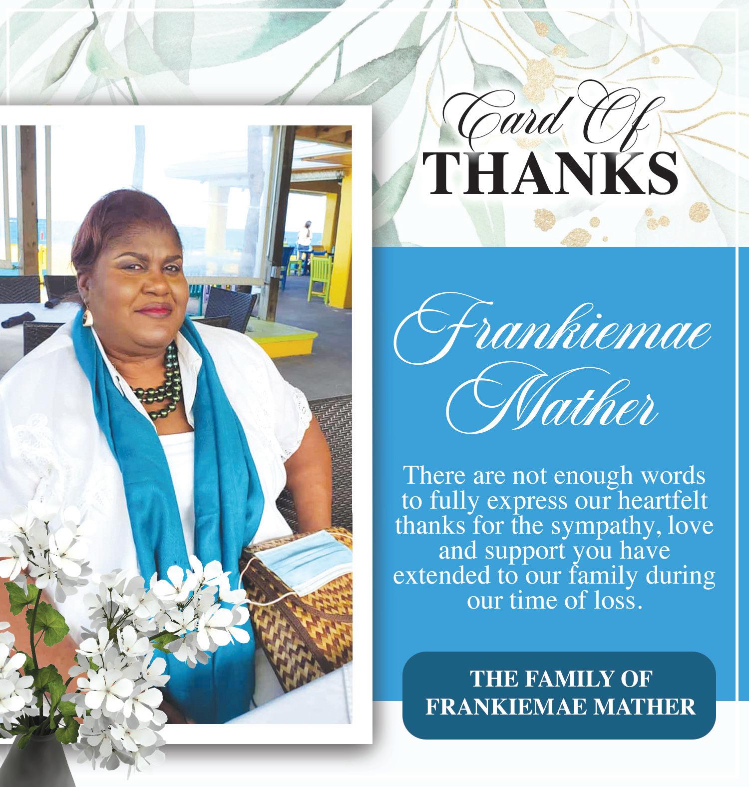 She is survived by her sons: Prince Fernander, Arthur Fernander, Leon Fernander & Samuel Fernander; daughters: Bernice Culmer, Beryl Rahming, Valencia Fernander-Rolle, Monique Miller & Mary Ellen Fernander; sister: Hilda Farrington; and other relatives too numerous to mention.
