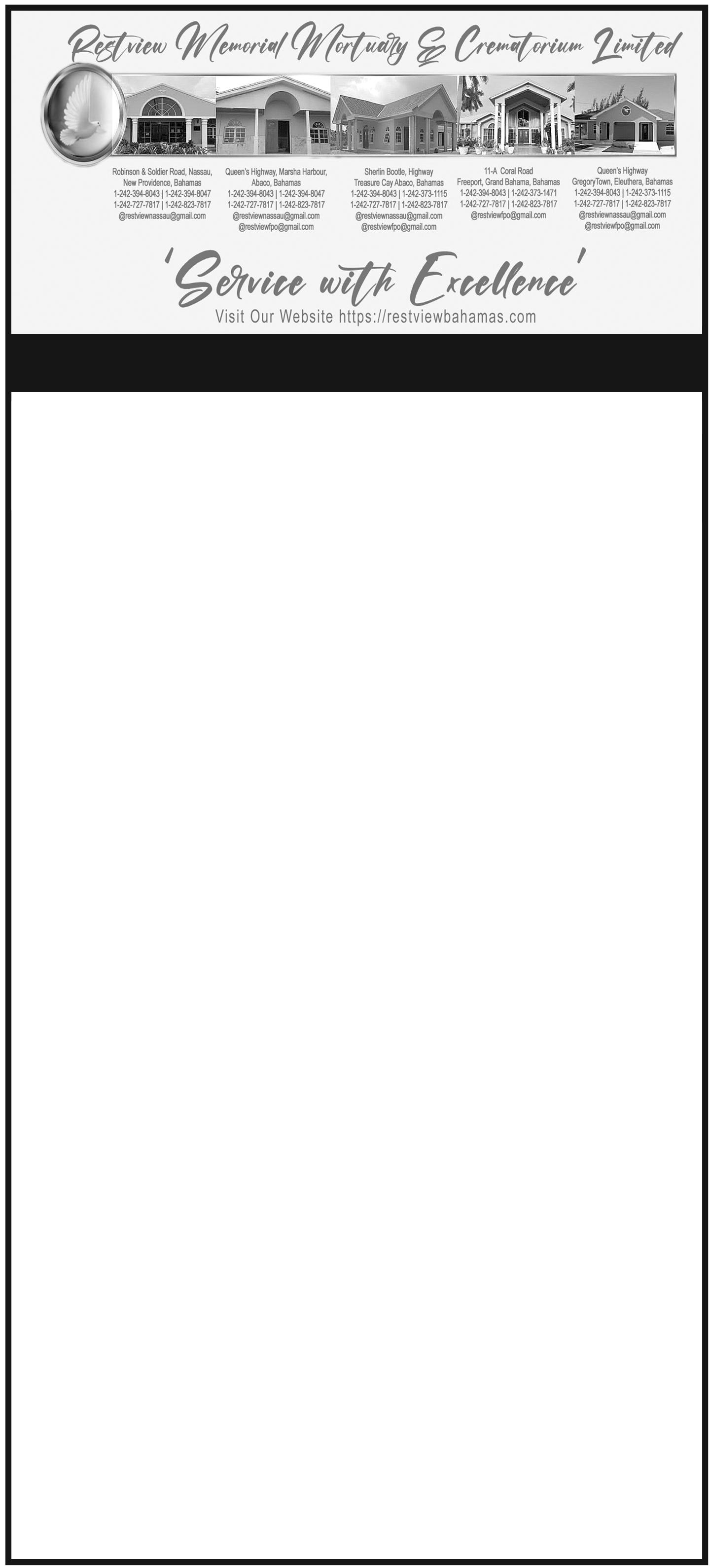 She is survived by her Brother: Pastor Harrison G. Butler; Sisters: Evangelist Levinna U. Butler-Rolle and Dr. Mavis P. Major; Sistersin-law: Mrs. Mildred Butler, Pastor Diana Butler and Mrs. Christine Butler; Nieces: Dr. Sharmaine Butler, Dr. Vidalia (Yaw) Butler-Poku, Ursula Butler, Julie (Lenny) Curtis, Attorney Jacinda P. Butler, Shavonne (Steve) Major-Butler and Lanna (Alan) Fernander, Vanria Butler, Miriam Smith, Theresa Clyde, Monique Babbs, B. Raquel Pratt, Shantel King and Tasha McKenzie; Nephews: Garfield, Attorney Truman (Fredericka) and Garrett (wife) Butler, Noland (Afarier), Jed and Bradford (Rochelle) Rolle, Cordell, Ishmael Terrance and Sergeant 2016 Ricardo Major, Elvis, Abraham and Mario Butler; Grandnieces: Tahlia Jewel, Talya and Taryn Butler, Hadassah Poku, Trinity Gibbs, Khloe Pratt, Dr. Julencia Curtis, Aniya Rolle, Aaliyah and Aliyanna Fernander; Grandnephews: Phinehas Poku, Trevon (Lynthis) and Keenan Butler, Kevon Gibbs, Ashley Curtis, Nevan and Noland, Jr. Rolle, Jezreel and Tajh Rolle and Javier Jean-Marie; Great grandnephew and niece: Messiah and Iris Butler; Dedicated nurses and caregivers: Mae Ferguson, Norma Dean, Ms. Brown, Sharlisa Saunders, Keshia Swaby, Marcia Nairn and Archer, Kellie Capron and Shelby Dorsette; Dedicated Doctors: Dr. Sharmaine Butler and Dr. Chrispin Gomez; Cousins: Rev. Ivan Butler, Sr., Rev. Joseph Saunders, Rev. Ulrick Butler, Dilith and Hendrick Nairn, Sr., Pamrica Rodgers, Carriemae Hunt, Winifred Campbell, Barbara Barnes, Bessie Mae Bess, Beaulah Morris, Bishop Helen McPhee, Paula Ferguson, Verenchia Butler, Peter Butler, Rev. Dr. Ivan Ford, Jr. and Joanne Butler, Samuel, Wrensworth, Nathan and Emmanuel Butler, Christine Neely, Marie Thorpe, Louise Simmons, Abraham, Michael and Elizabeth Butler, Apostles Paul and David Butler, Paul Butler (Atl.), Theresa White, (Det. Mich.), Winifred Thompson, Andrew and Tony McKinney, Dr. Norman and Lloyd Gay, Rev. Patrick and Rudy Levarity, Ingrid Bain, Rev. Betty Williams, Francina Anderson, Katie Horton, Vernice Miller, Chief Superintendent of Police Walter Henderson, Elaine Smith, Hon. Melanie Griffin, Denise Barnes, Latoya Forbes, Hermean Sturrup, Pastor Franchon Braynen, Melony Hall, Rosheva Hepburn, Elmeada Storr, Ethlyn Adderley, Ruth Miller, Ruby Gordon, Ruth Charlton, Winifred Bannister, Mildred Butterfield, Ellamae Blyden, Cheryl Brown, Sonia Timothy-Knowles and Kevin Timothy, Rennard and Janet Storr, Dr. Ricky Davis, Matthew, Ezra and Earl Davis,